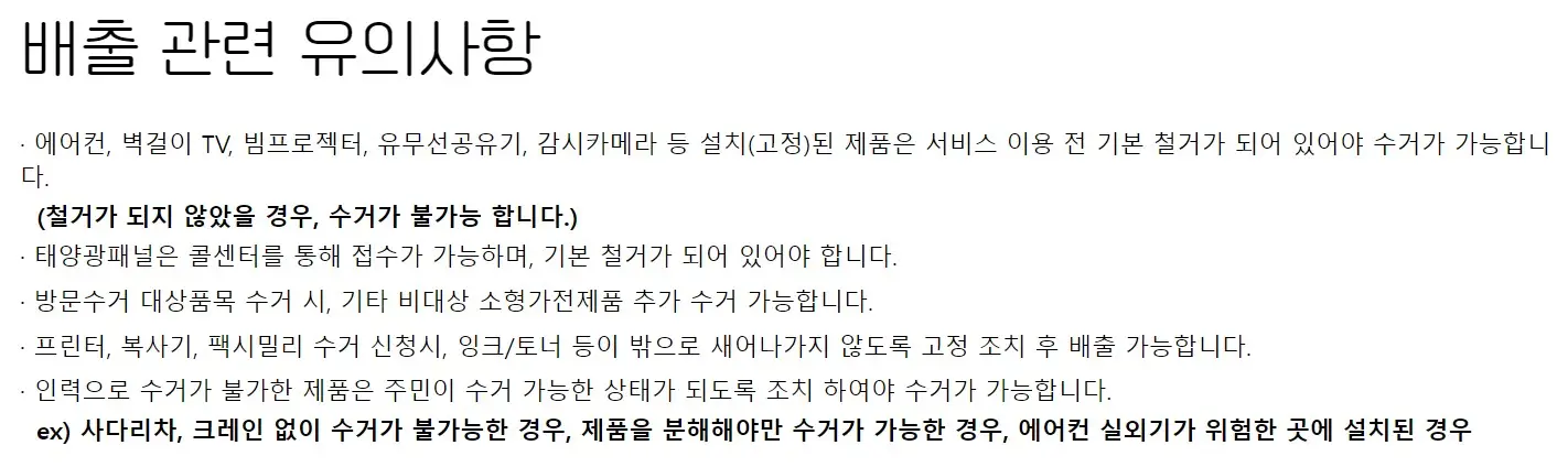 - 에어컨이나 벽걸이 TV는 철거가 완료되어 있어야 수거가 가능합니다.