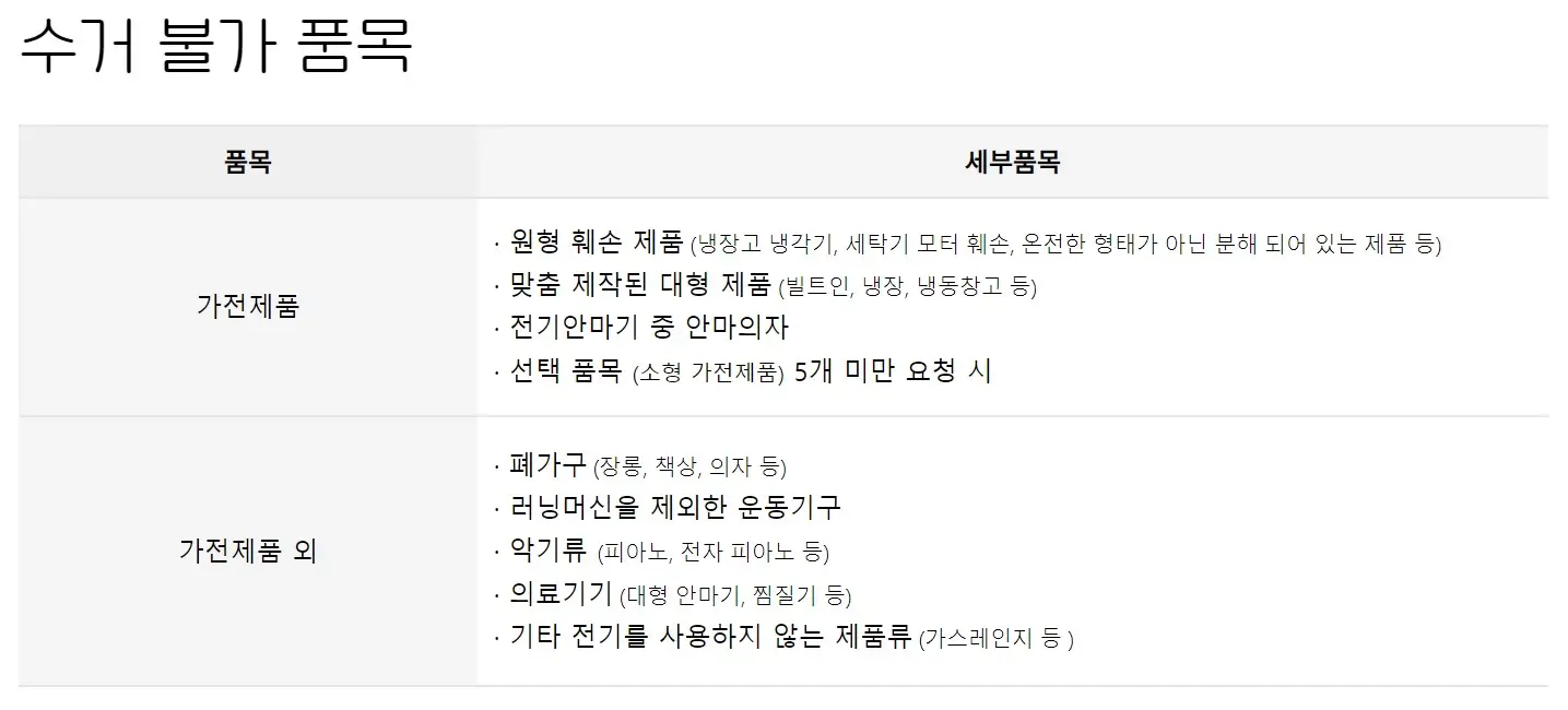 | 수거 가능한 품목 | TV, 냉장고, 세탁기 등 대형 가전 및 소형 가전 |