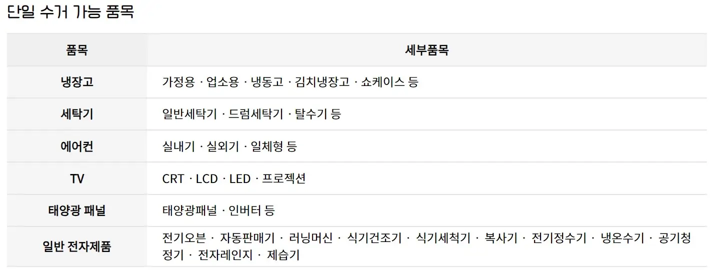| 수거 가능한 품목 | TV, 냉장고, 세탁기 등 대형 가전 및 소형 가전 |