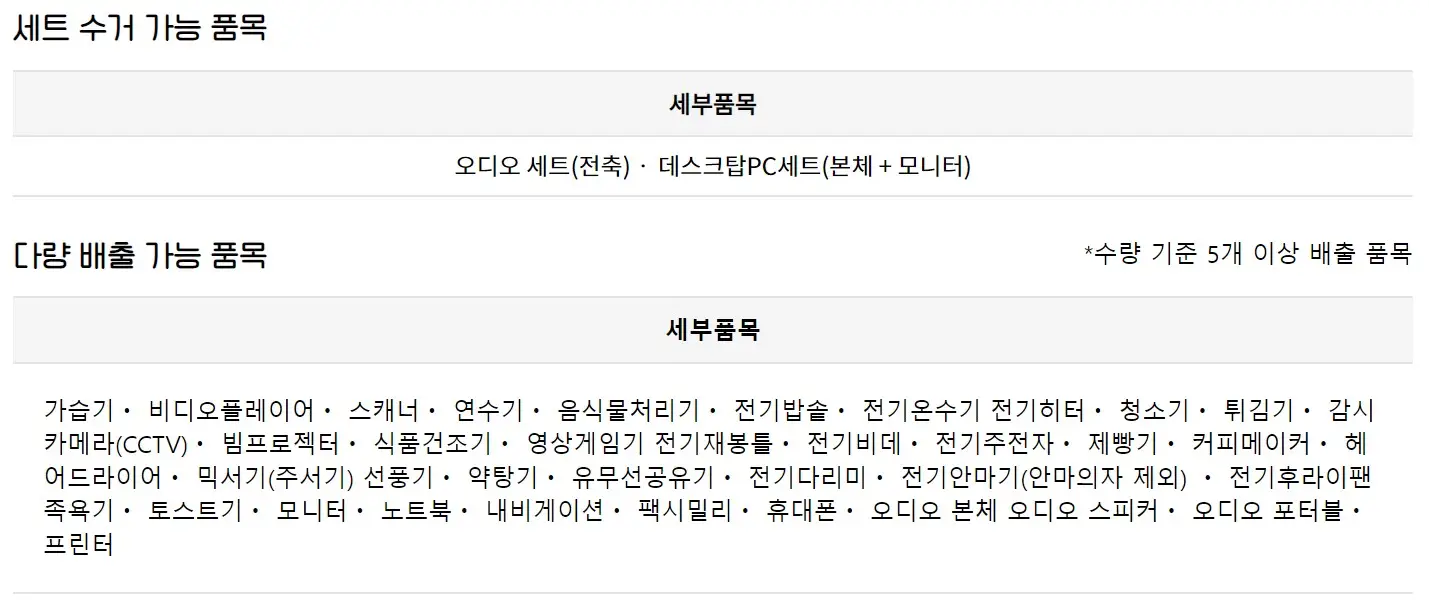| 수거 조건 | 소형 가전은 5개 이상일 경우 수거 가능 |