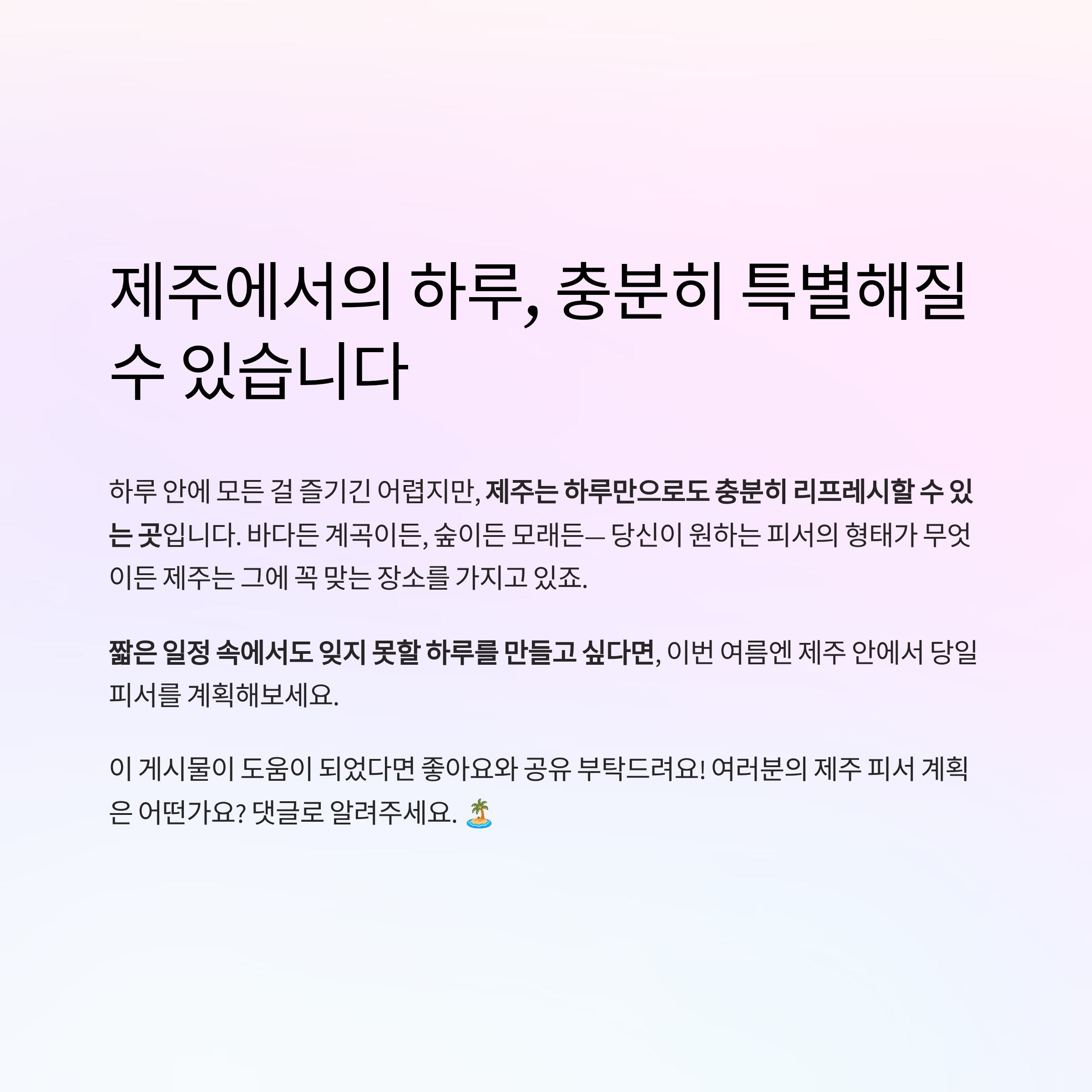 제주는 하루만으로도 충분히 리프레시할 수 있는 곳입니다.