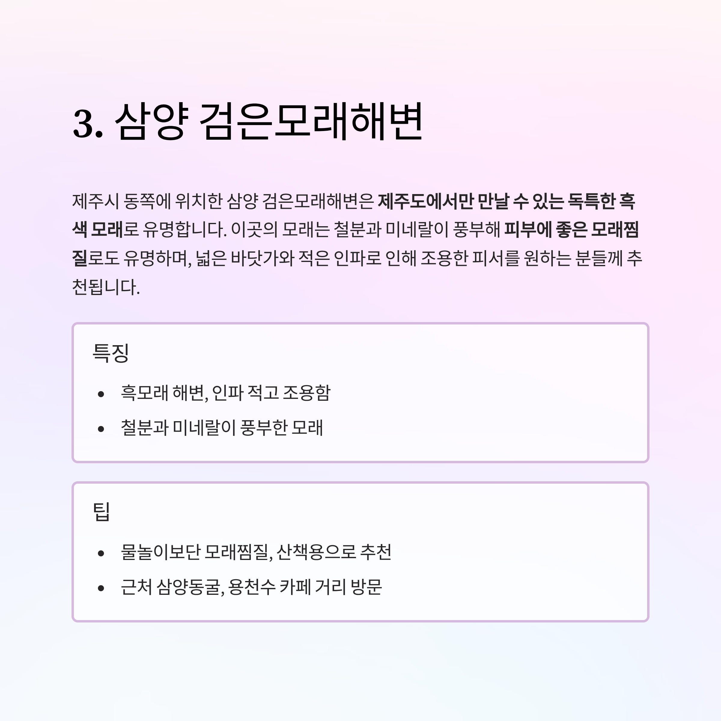 | 특징 | 흑모래 해변, 인파 적고 조용함 |