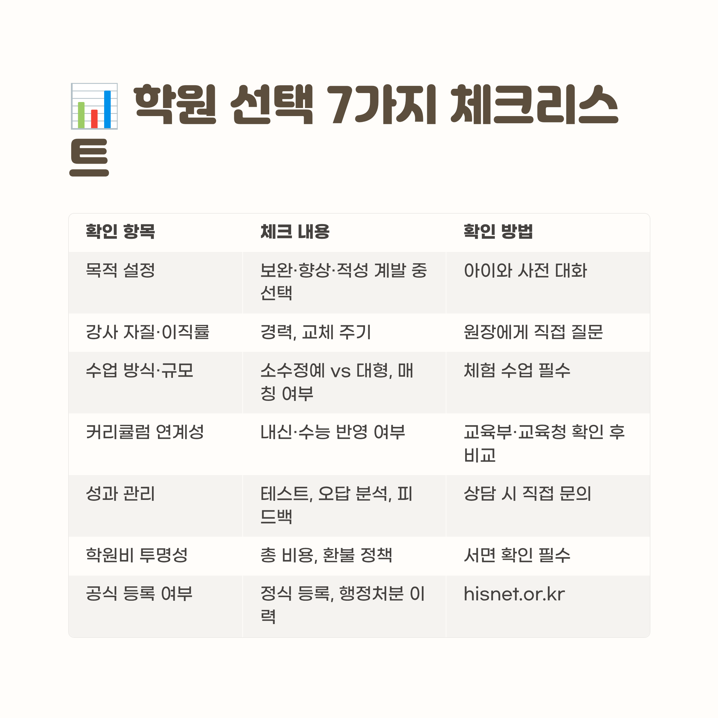 📊 요약표: 학원 선택 7가지 핵심 체크리스트
