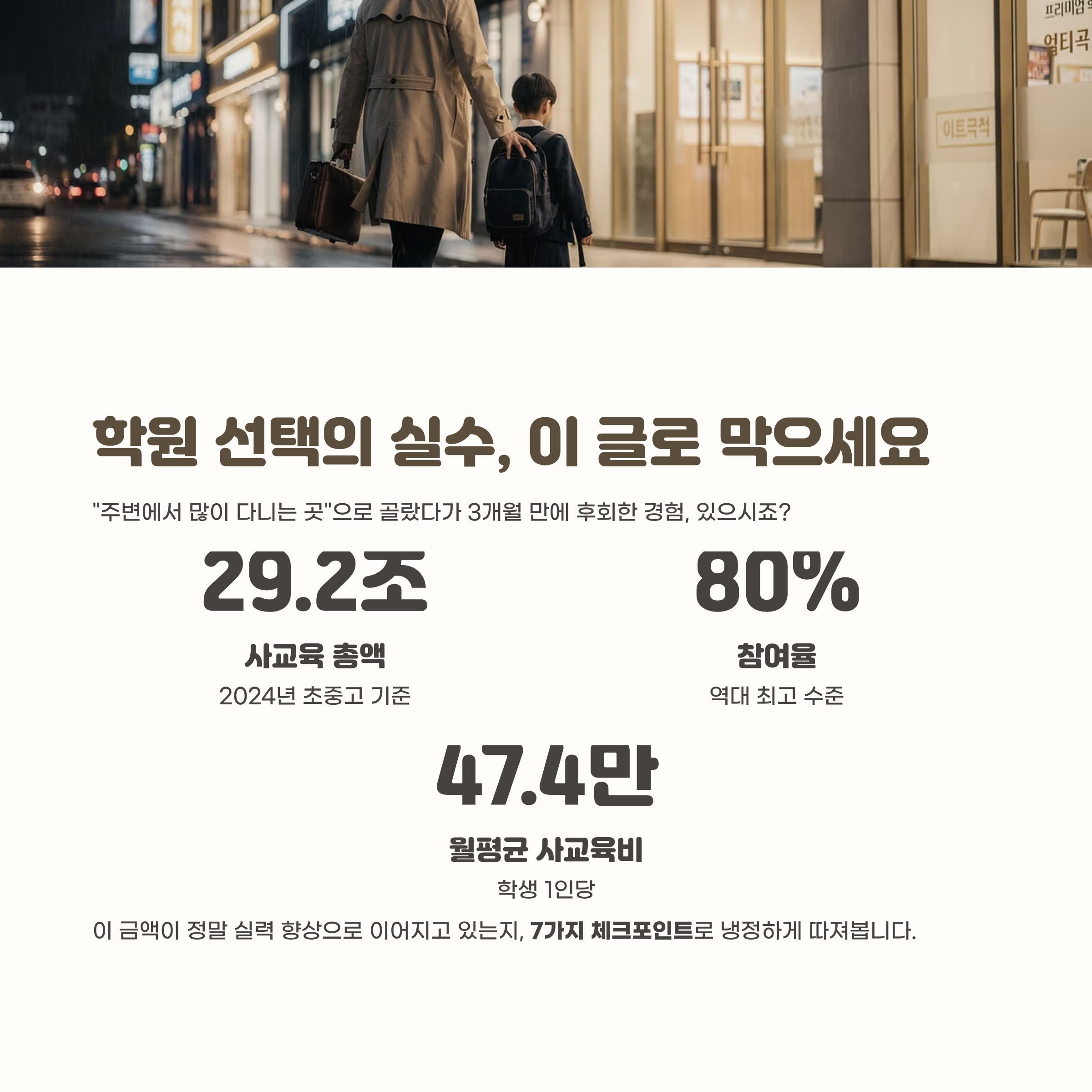2024년 통계에 따르면 우리나라 초중고 학생의 사교육 총액은 약 29.2조원에 달하며, 사교육 참여율은 80.0%, 학생 1인당 월평균 사교육비는 47만 4천 원(참여 학생 기준 59만 2천 원)으로 역대 최고 수준을 기록했습니다. 이 어마어마한 금액이 정말 아이의 실력 향상으로 이어지고 있는지, 혹시 잘못된 학원 선택으로 새고 있는 건 아닌지 지금부터 냉정하게 따져볼 필요가 있습니다.