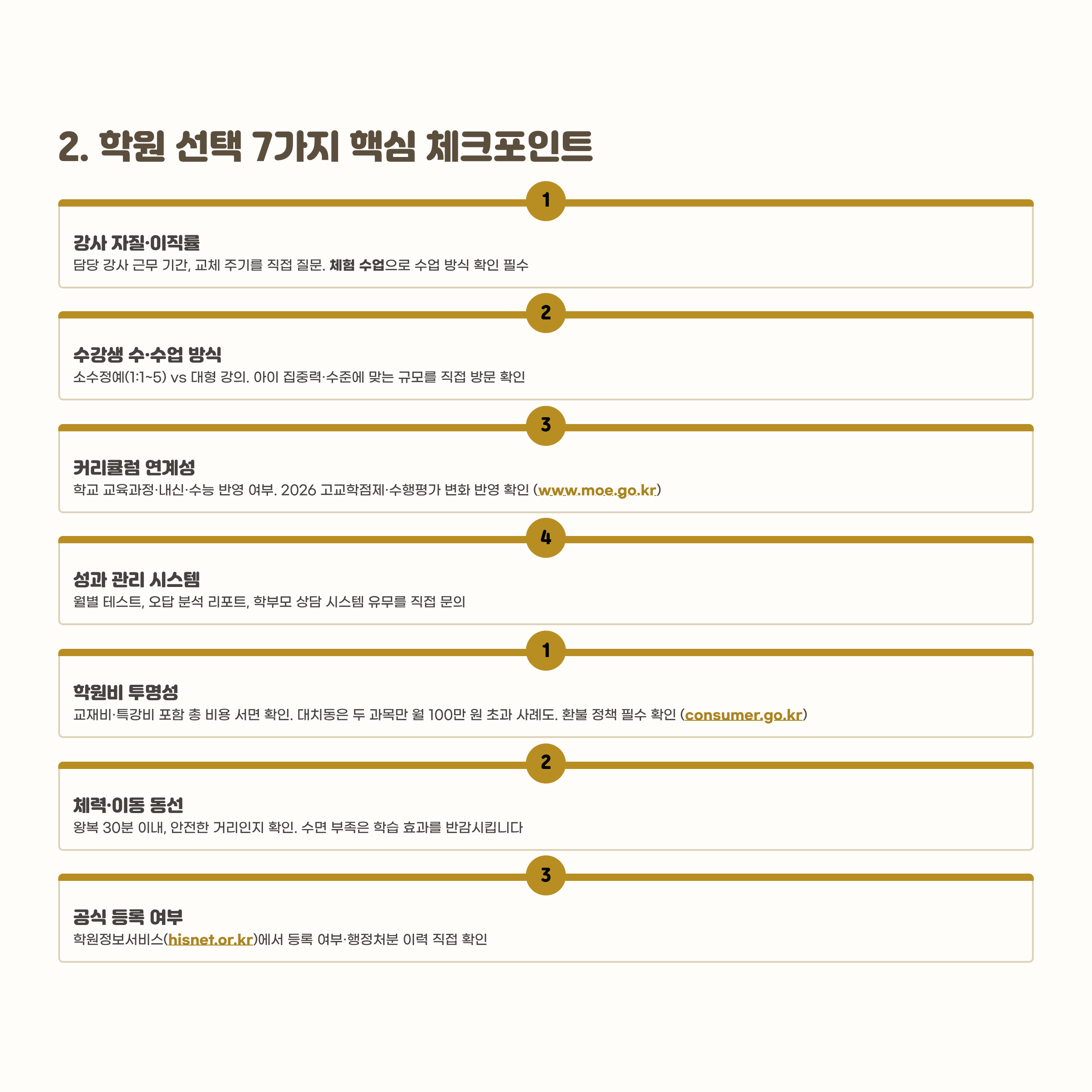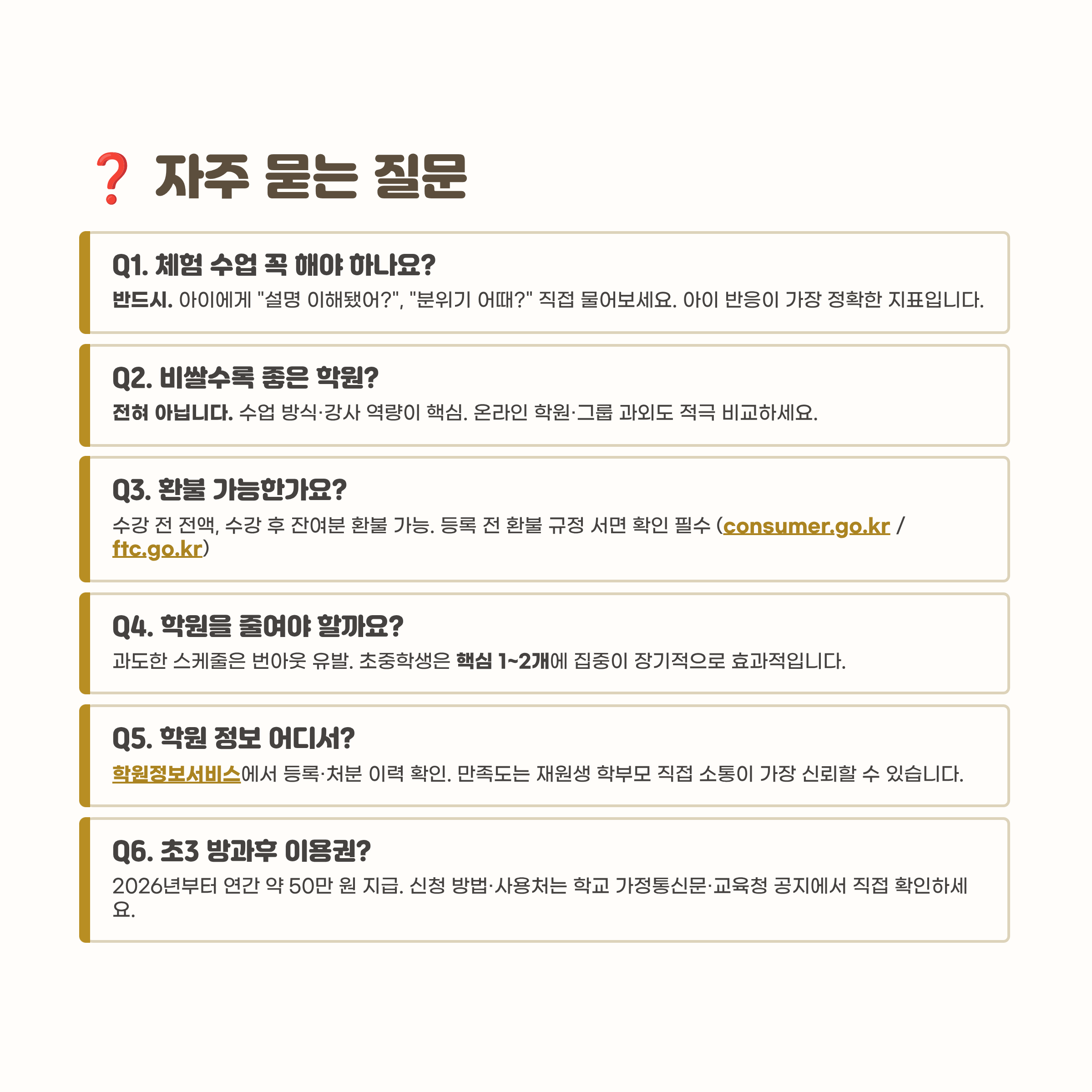 | 학원비 투명성 | 교재비·특강비 포함 총 비용, 환불 정책 | 서면 확인 필수 |