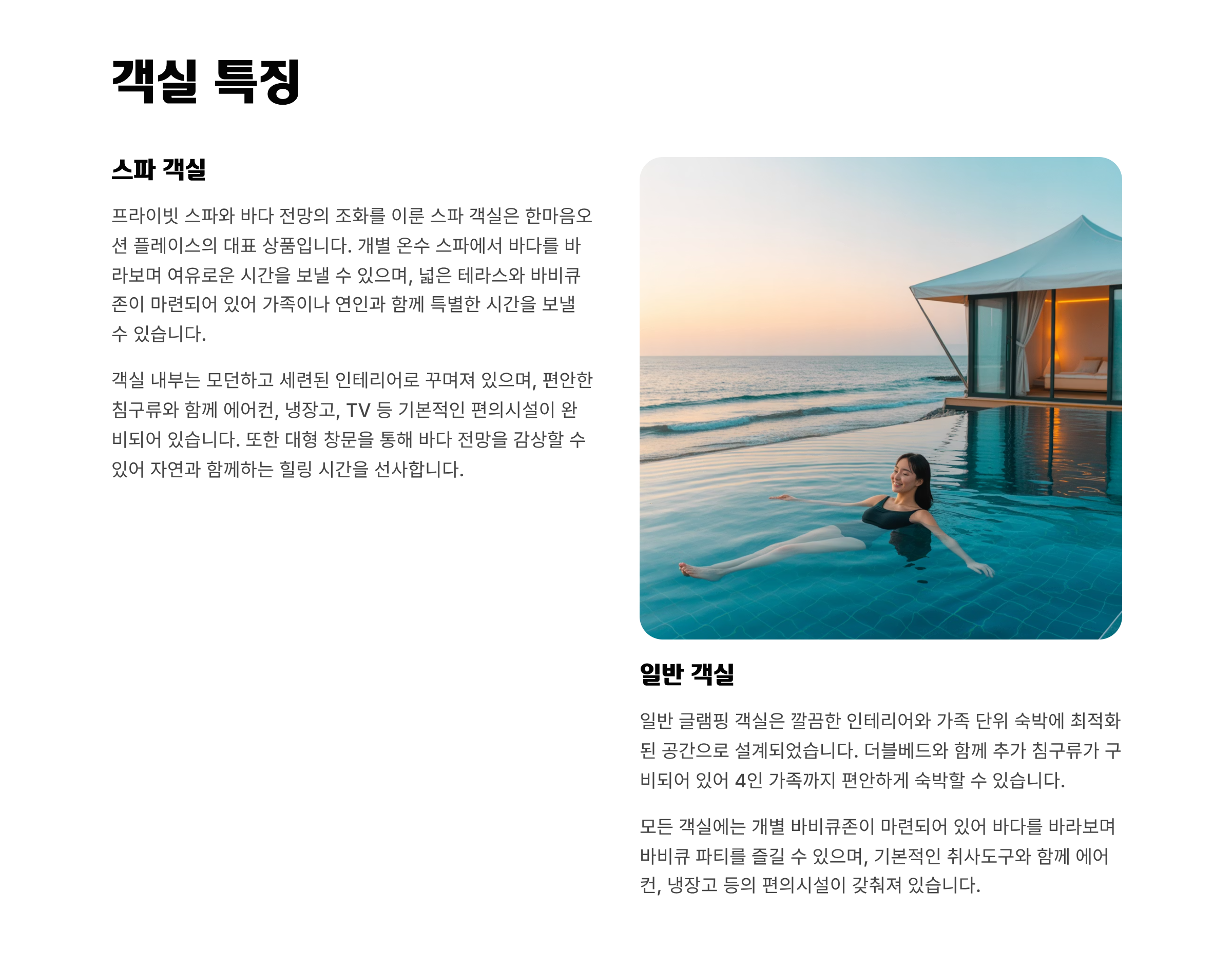| 스파 글램핑형 | 30만~45만원 | 45만~60만원 | 개별 스파, 오션뷰, 바비큐존 완비 |