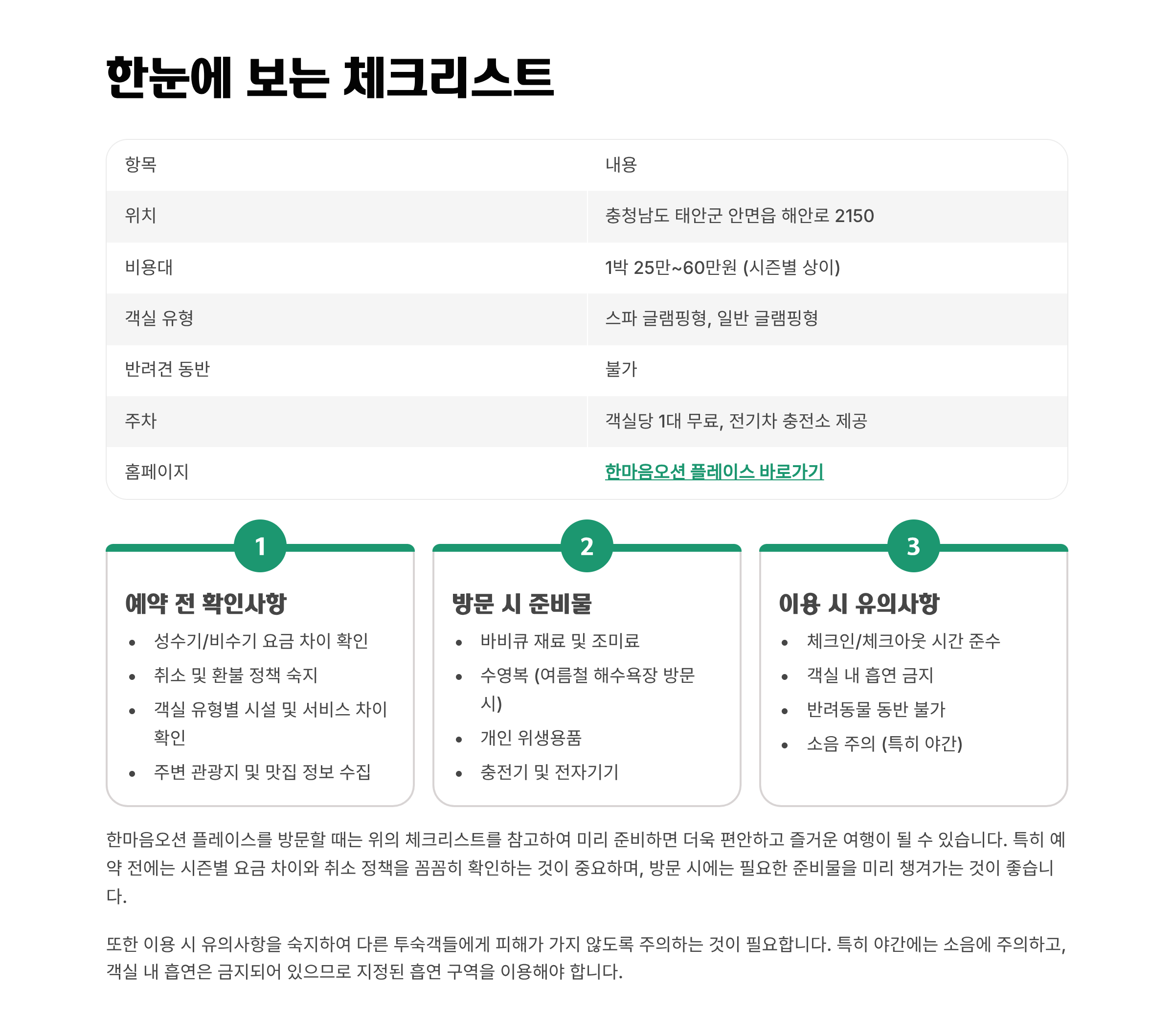 태안 해변과 맞닿은 곳에서 파도 소리를 들으며 스파와 글램핑을 동시에 즐길 수 있다면? 한마음오션 플레이스는 해수욕과 힐링 여행을 한 번에 경험할 수 있는 인기 글램핑장입니다. 이번 글에서는 최신 정보 기반으로 위치, 비용, 객실, 맛집, 관광지, 예약 팁, 방문객 후기를 모두 정리했습니다.