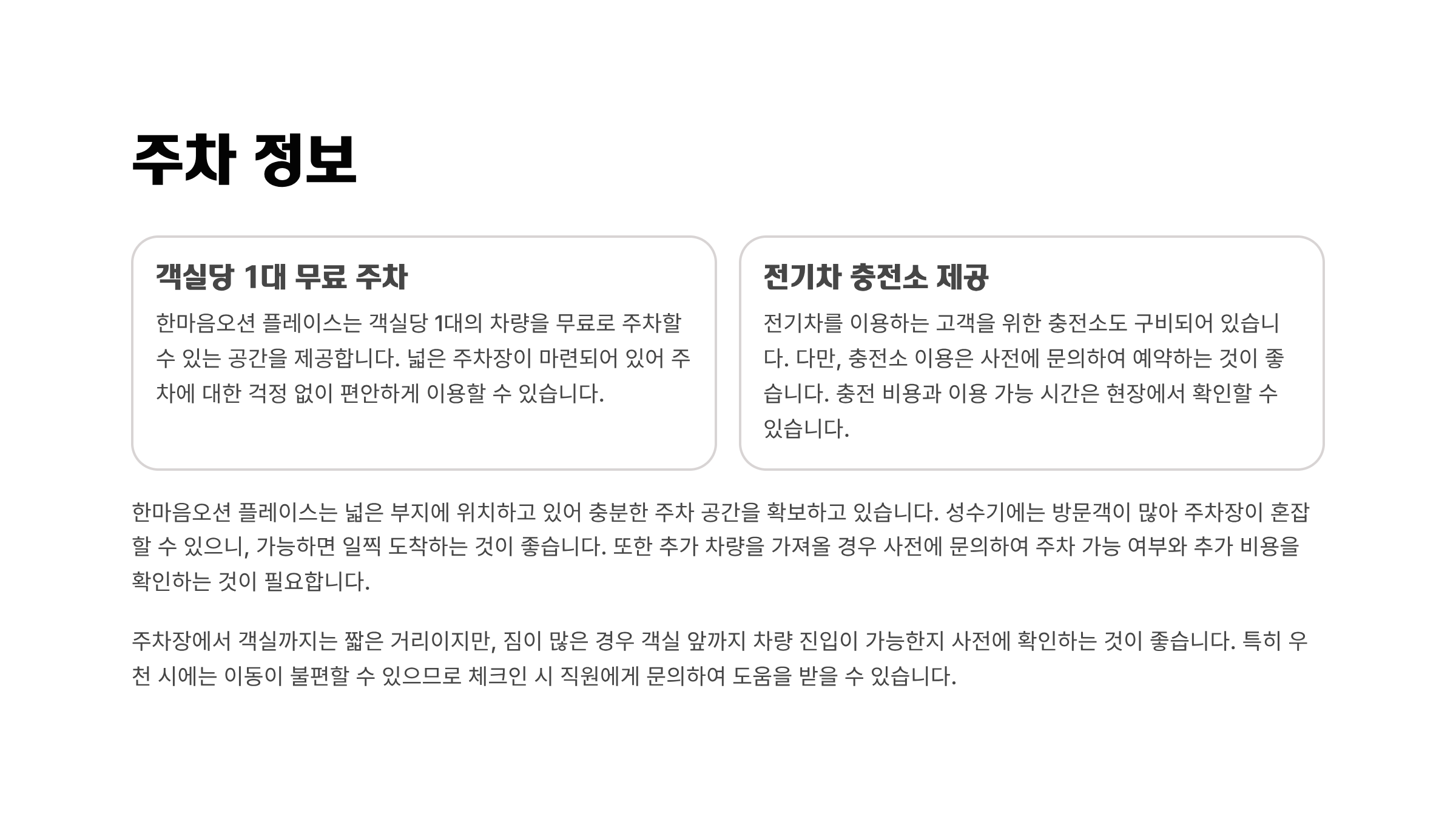 | 주차 | 객실당 1대 무료, 전기차 충전소 제공 |