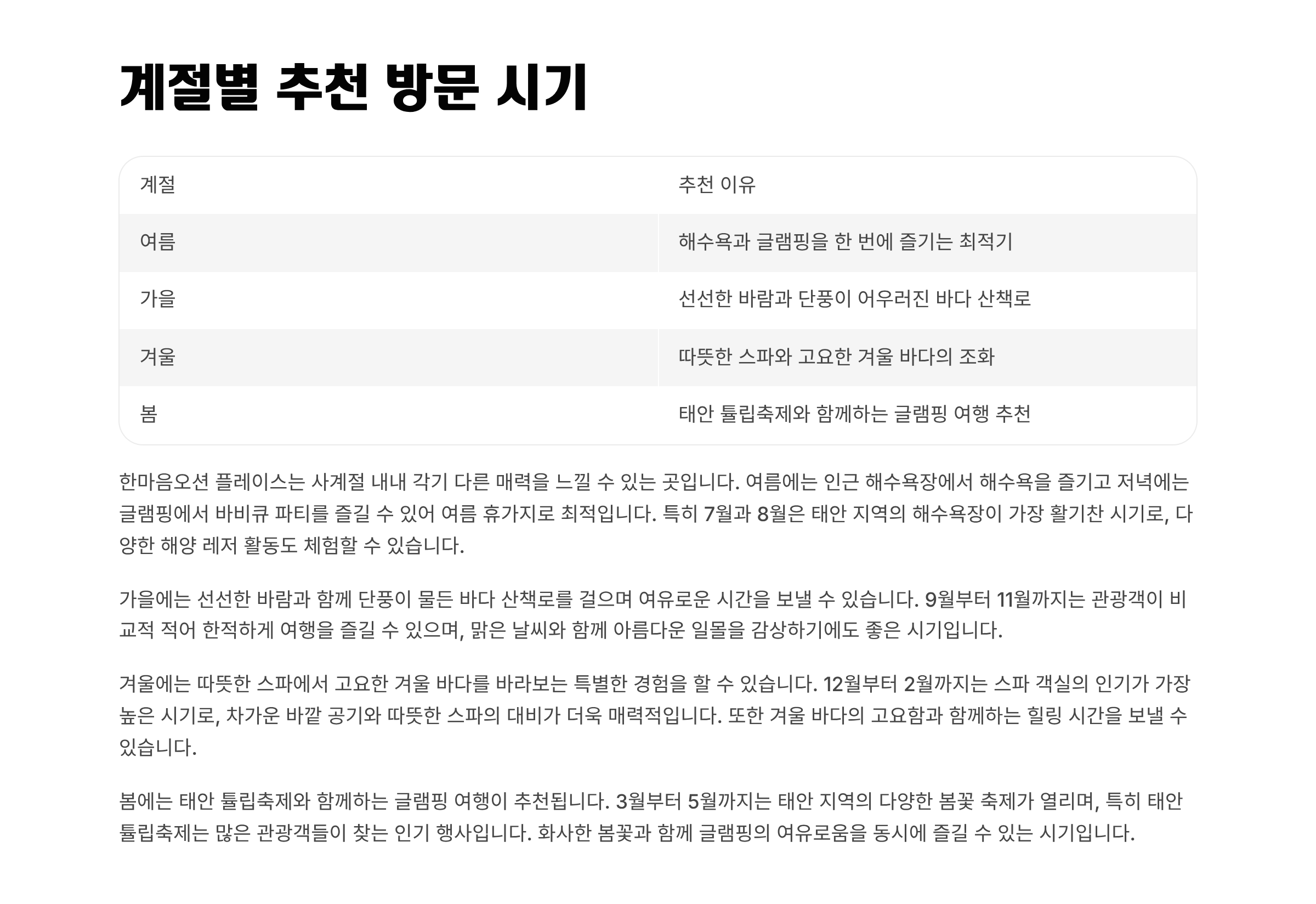 | 여름 | 해수욕과 글램핑을 한 번에 즐기는 최적기 |