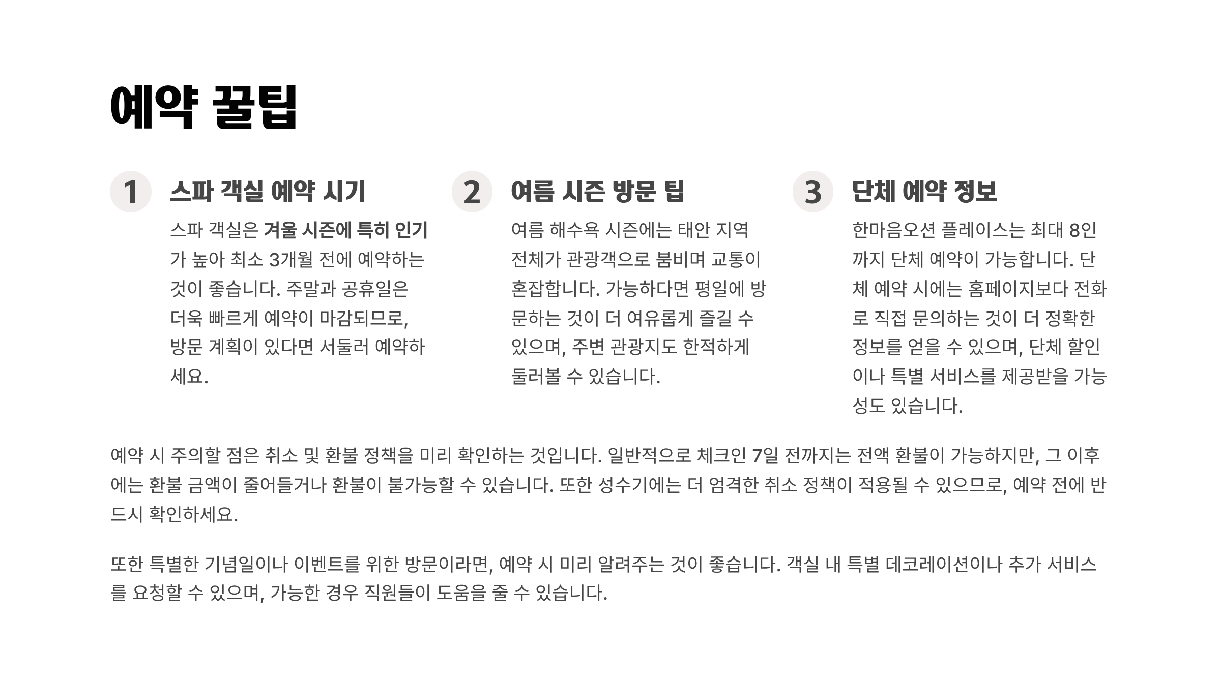 - 스파 객실은 겨울 시즌 인기, 최소 3개월 전 예약 추천