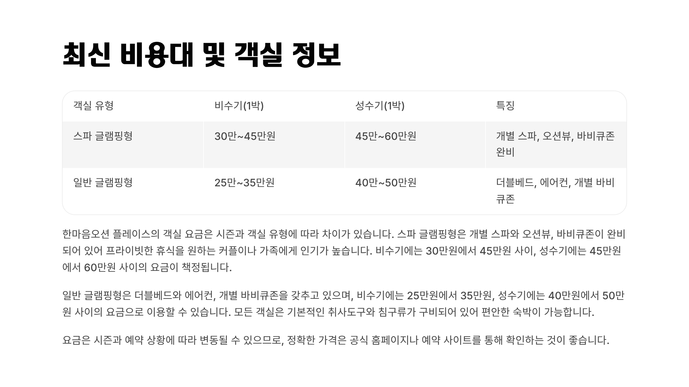 | 비용대 | 1박 25만~60만원 (시즌별 상이) |