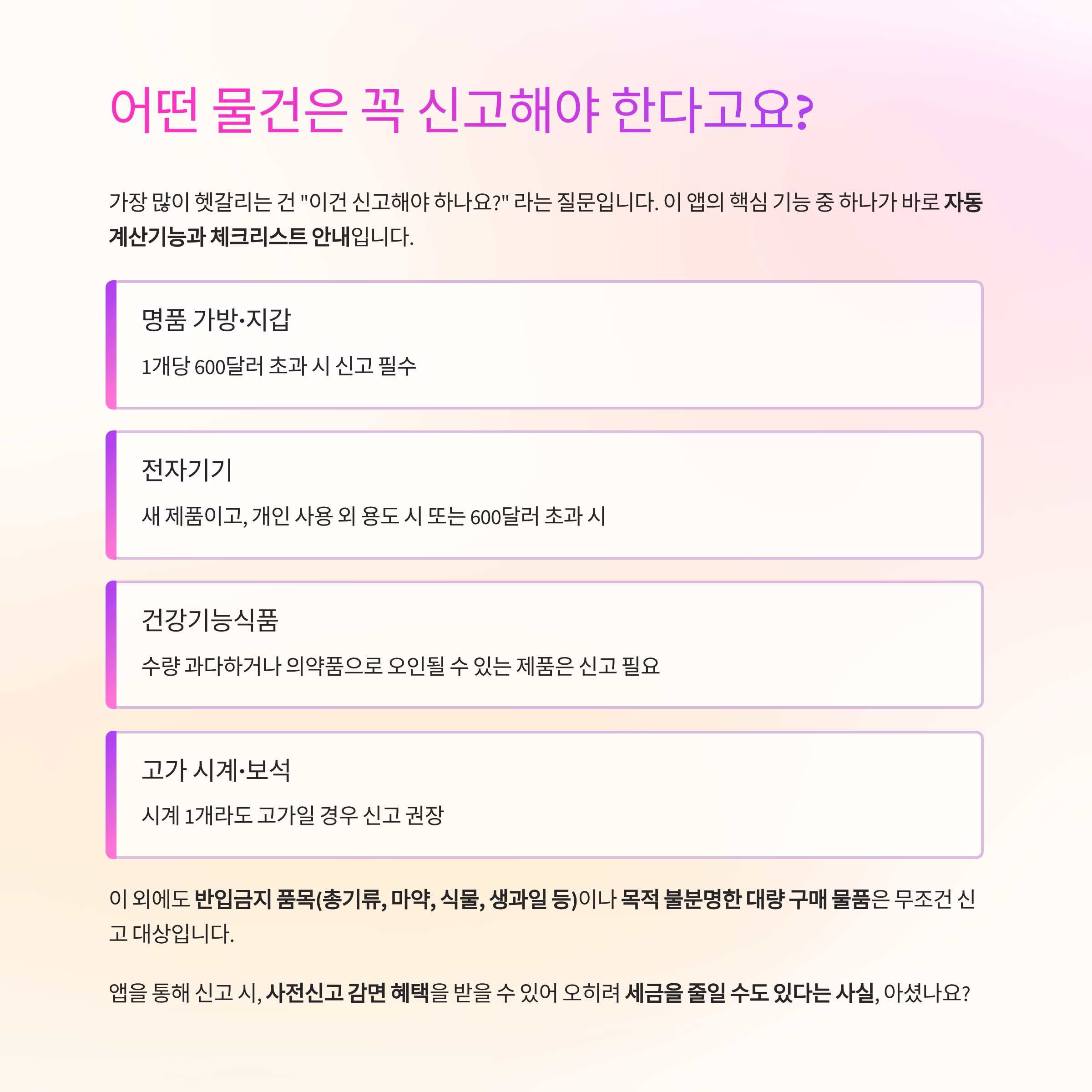 | 세관 직원이 별도 검토하나요? | 고가 물품 신고 시에는 확인할 수 있으며, 앱 기록 기반으로 신속 처리 |