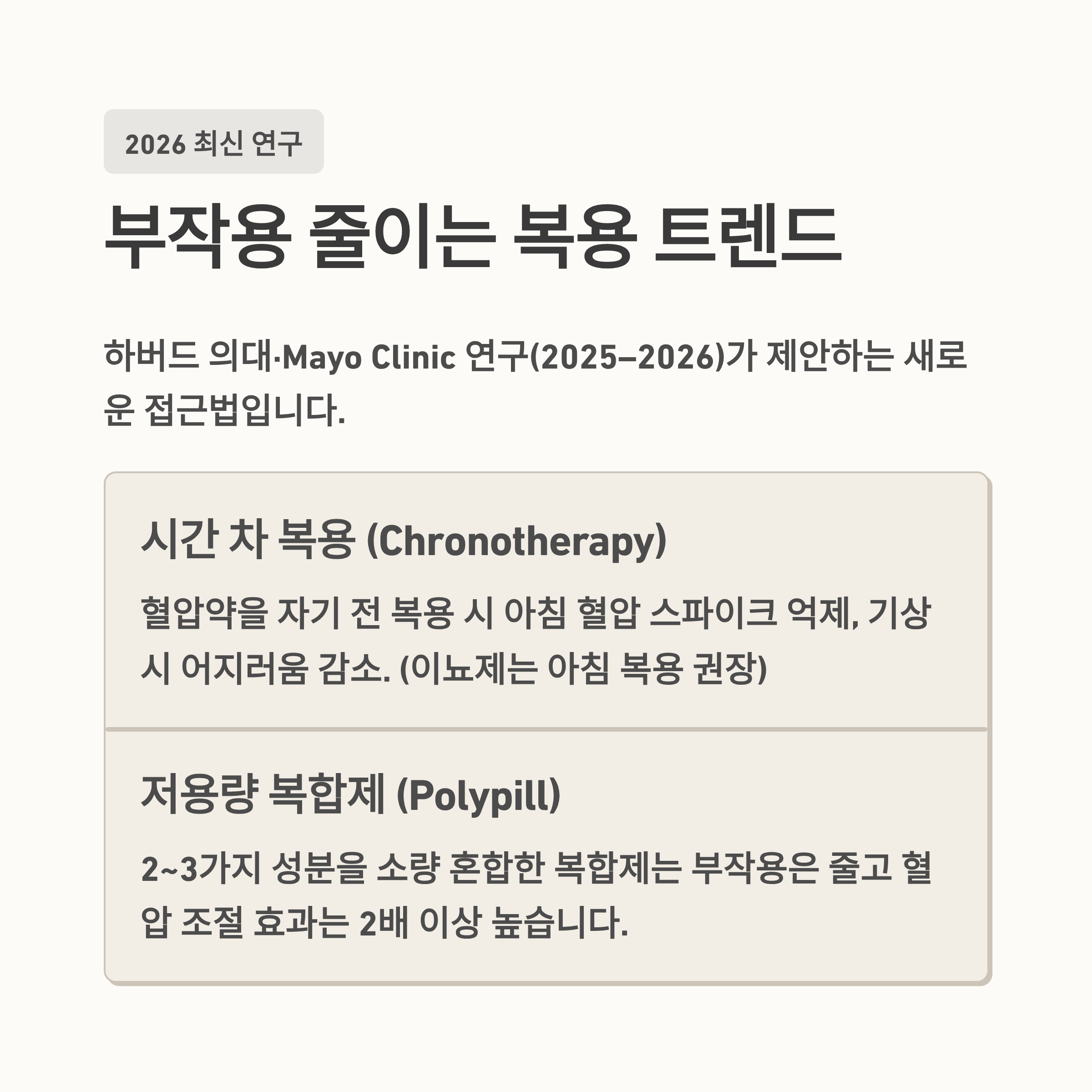 한 가지 약을 고용량으로 먹는 것보다, 두 세 가지 성분을 아주 적은 용량으로 섞은 복합제를 먹을 때 부작용은 줄고 혈압 조절 효과는 2배 이상 높다는 것이 2026년 의학계의 대세입니다.