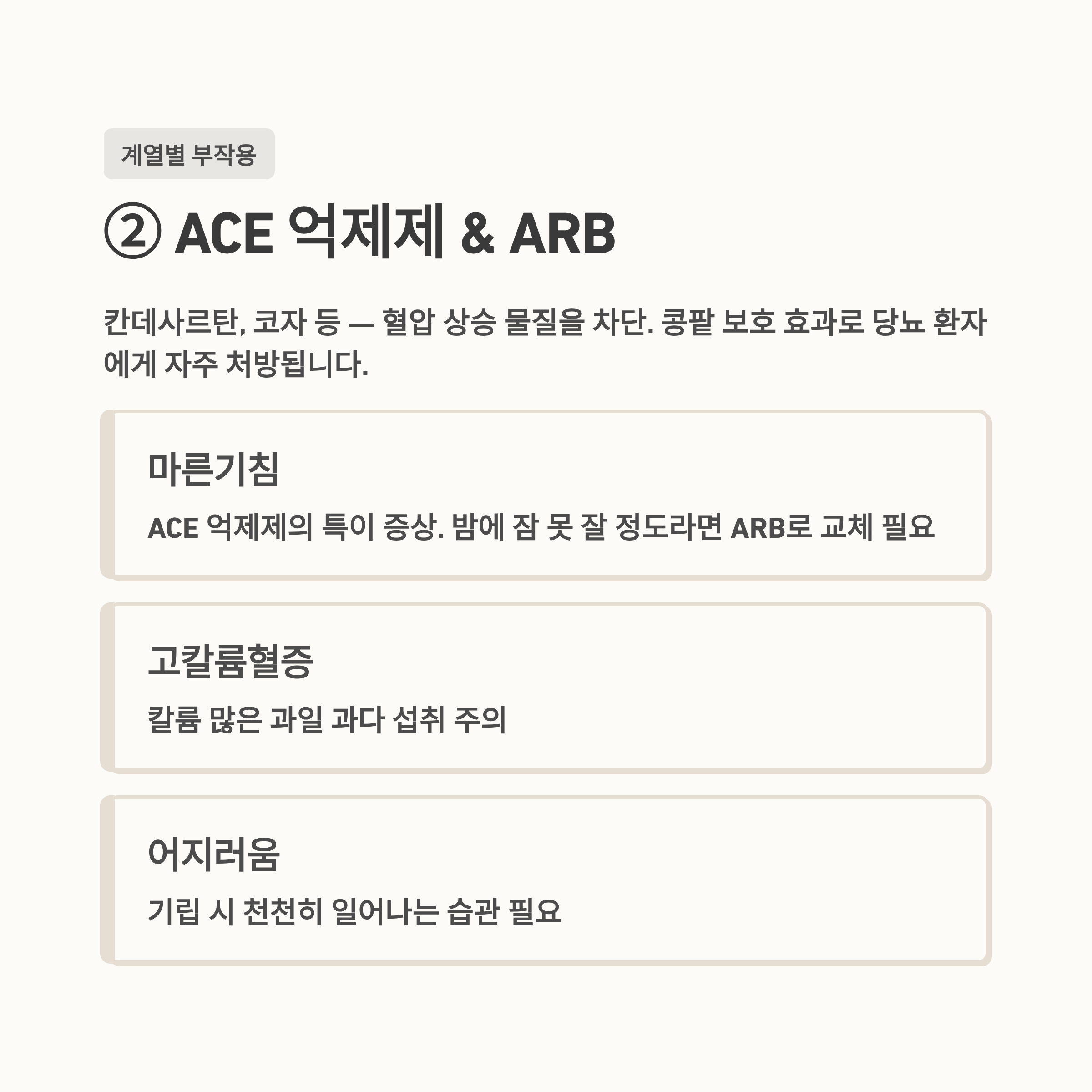 | ACE/ARB | 마른기침, 고칼륨혈증 | 칼륨 많은 과일 과다 섭취 주의 |