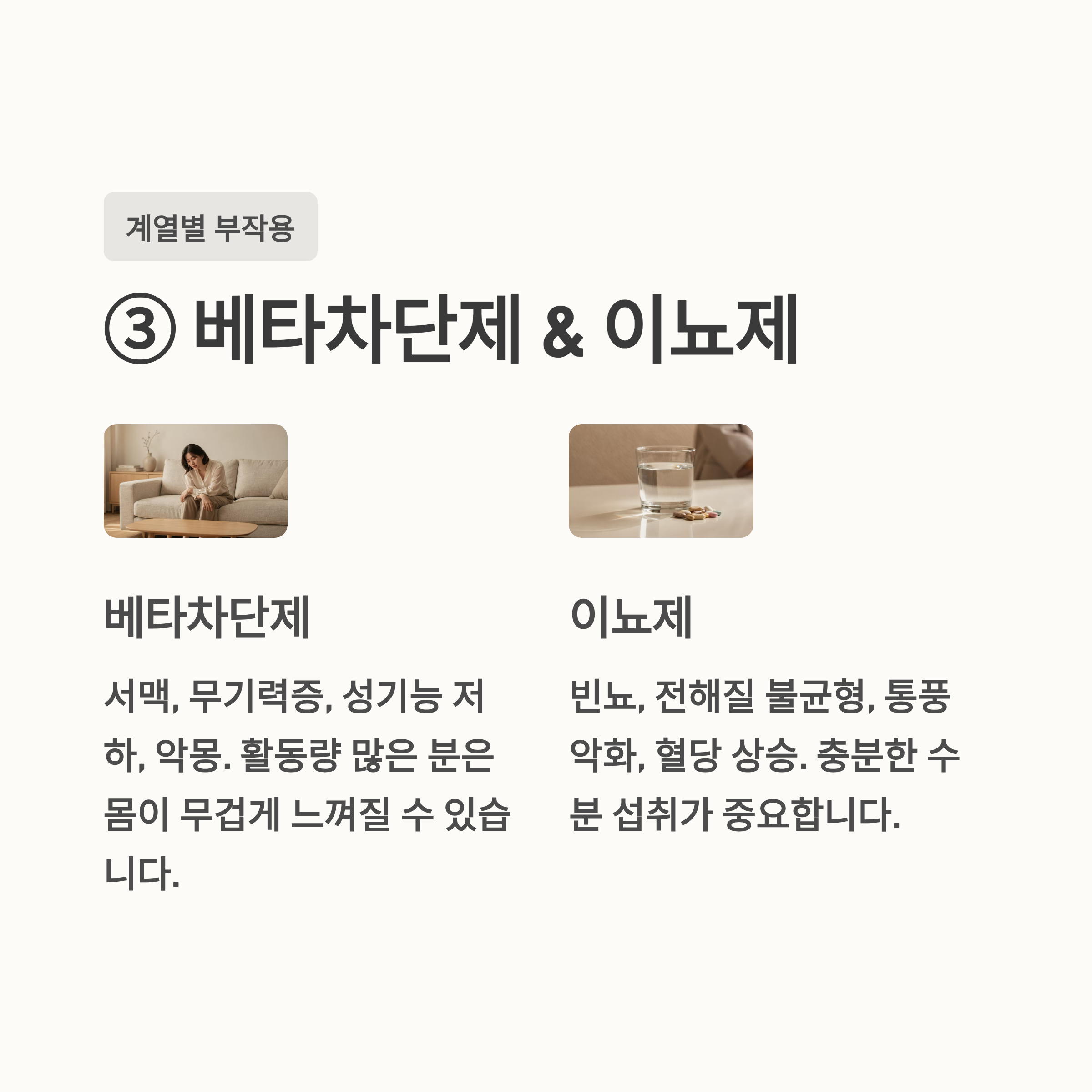 - 대표 부작용: 서맥(맥박이 너무 느려짐), 무력감, 성기능 저하, 악몽.