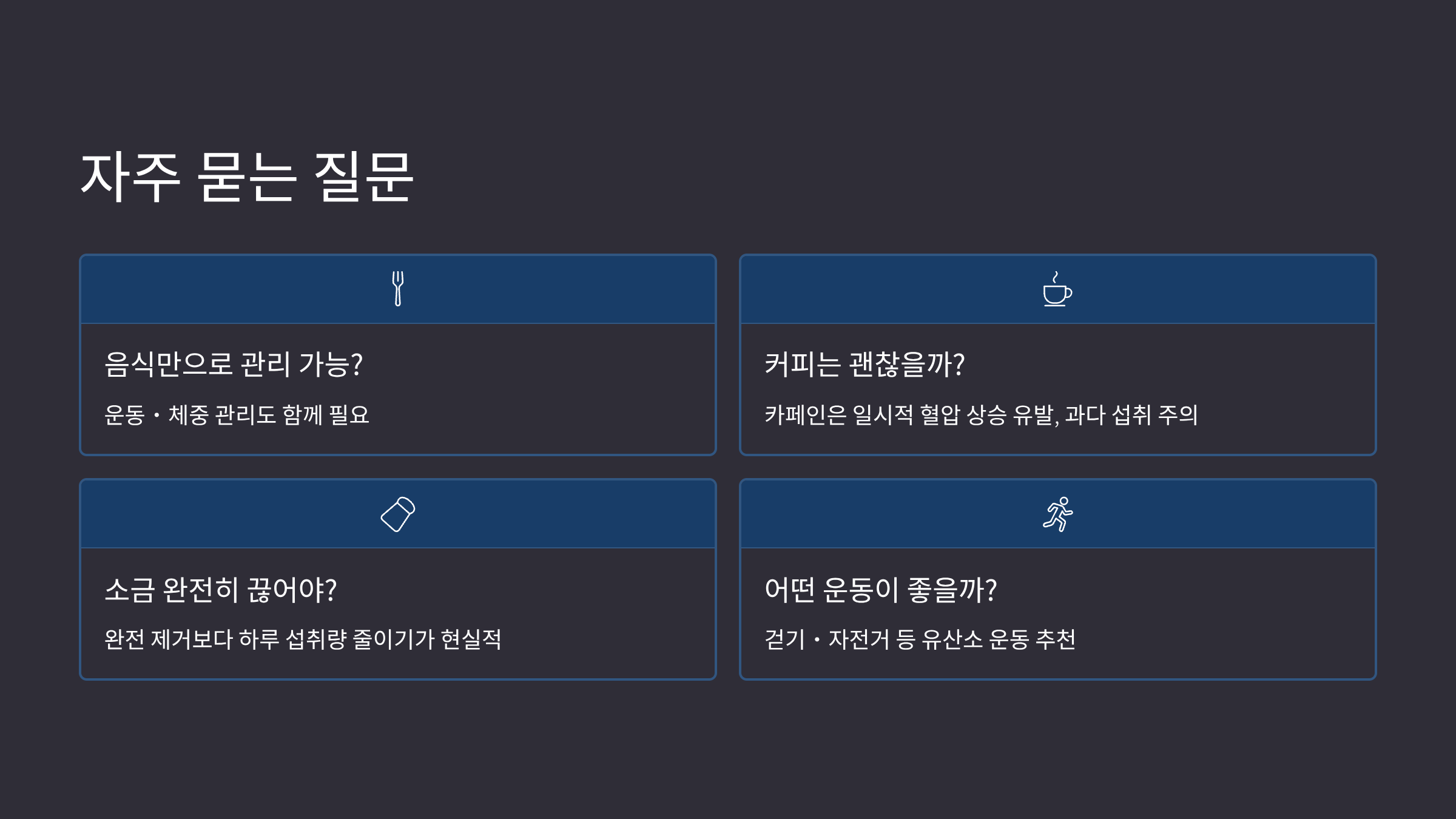 A. 음식 관리가 중요하지만 운동과 체중 관리도 함께 이루어져야 효과적인 혈압 관리가 가능합니다.