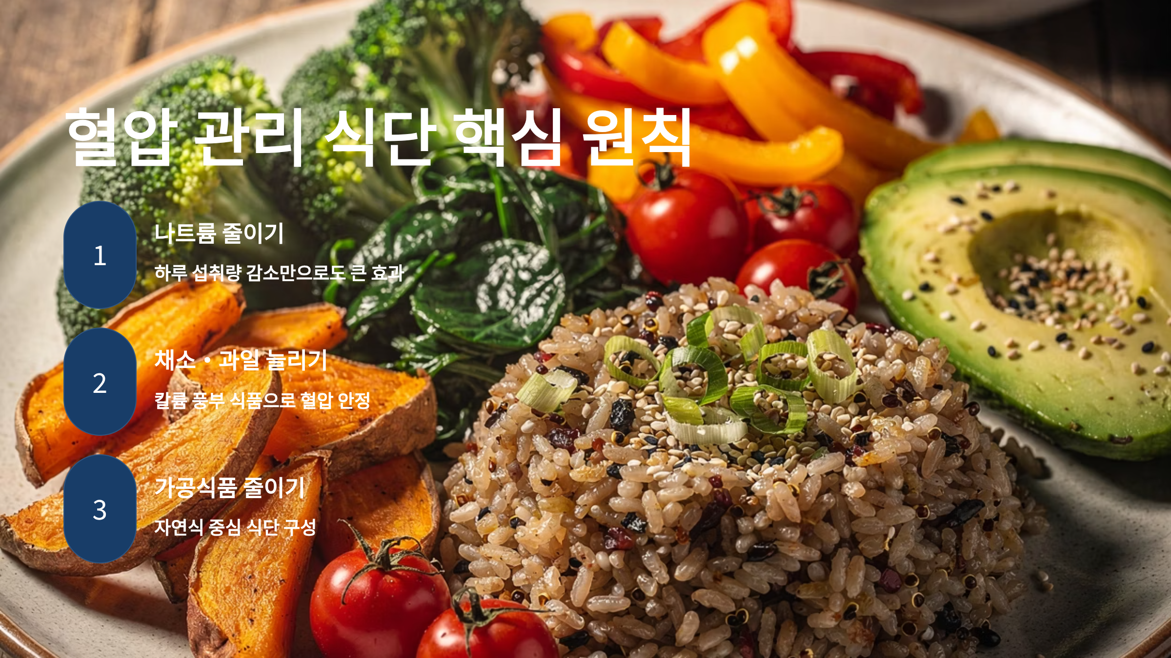 혈압을 낮추는 데 도움이 되는 식단을 유지하려면 몇 가지 핵심 원칙을 함께 지키는 것이 중요합니다. 단순히 특정 음식만 먹는 것보다 전체적인 식단 균형이 훨씬 중요하다고 합니다.