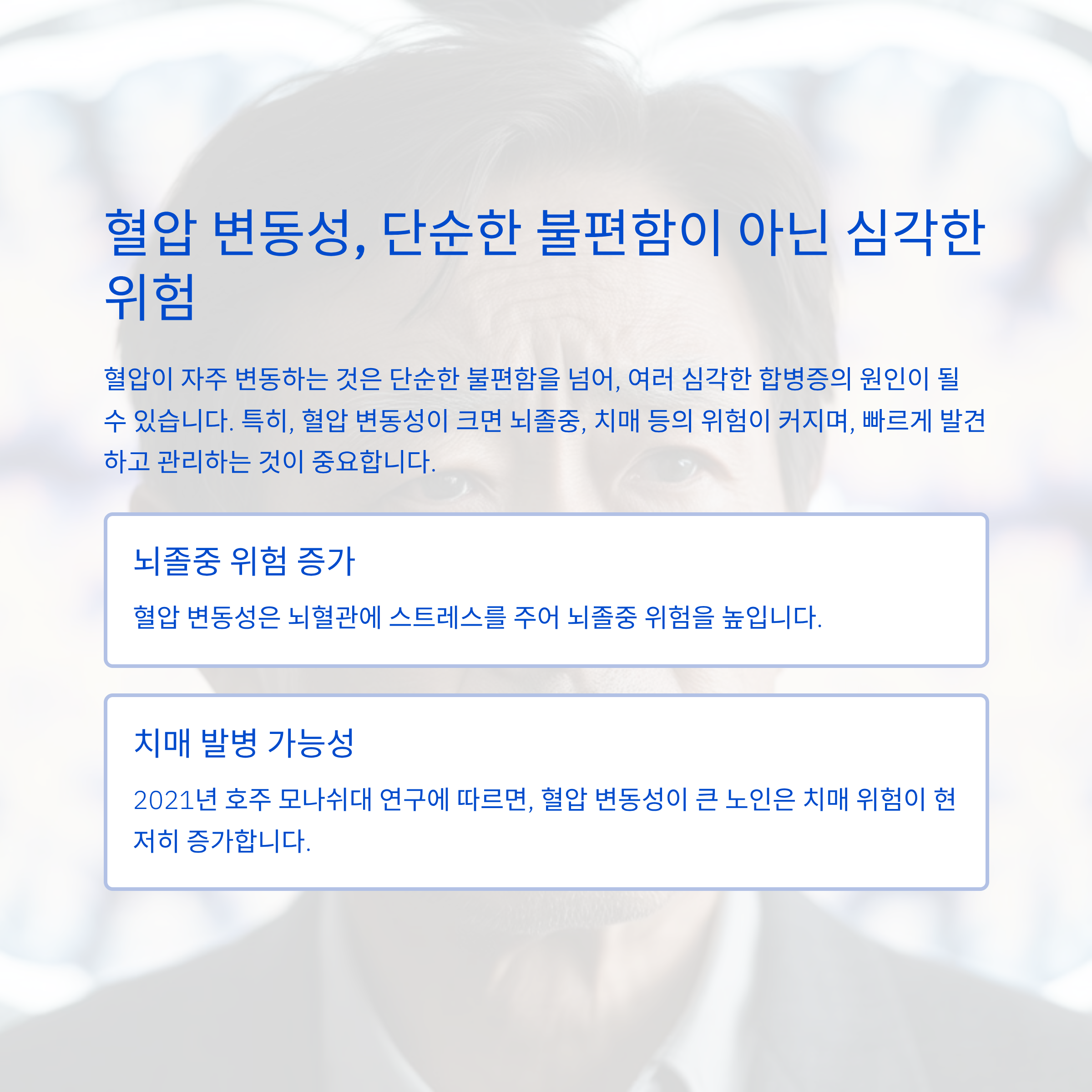 혈압이 자주 변동하는 것은 단순한 불편함을 넘어서, 여러 심각한 합병증의 원인이 될 수 있습니다. 특히, 혈압 변동성이 크면 뇌졸중, 치매 등의 위험이 커지며, 빠르게 발견하고 관리하는 것이 중요합니다. 그렇다면 혈압 변동성은 왜 위험하고, 어떻게 관리할 수 있을까요? 지금부터 그 방법을 살펴보겠습니다.