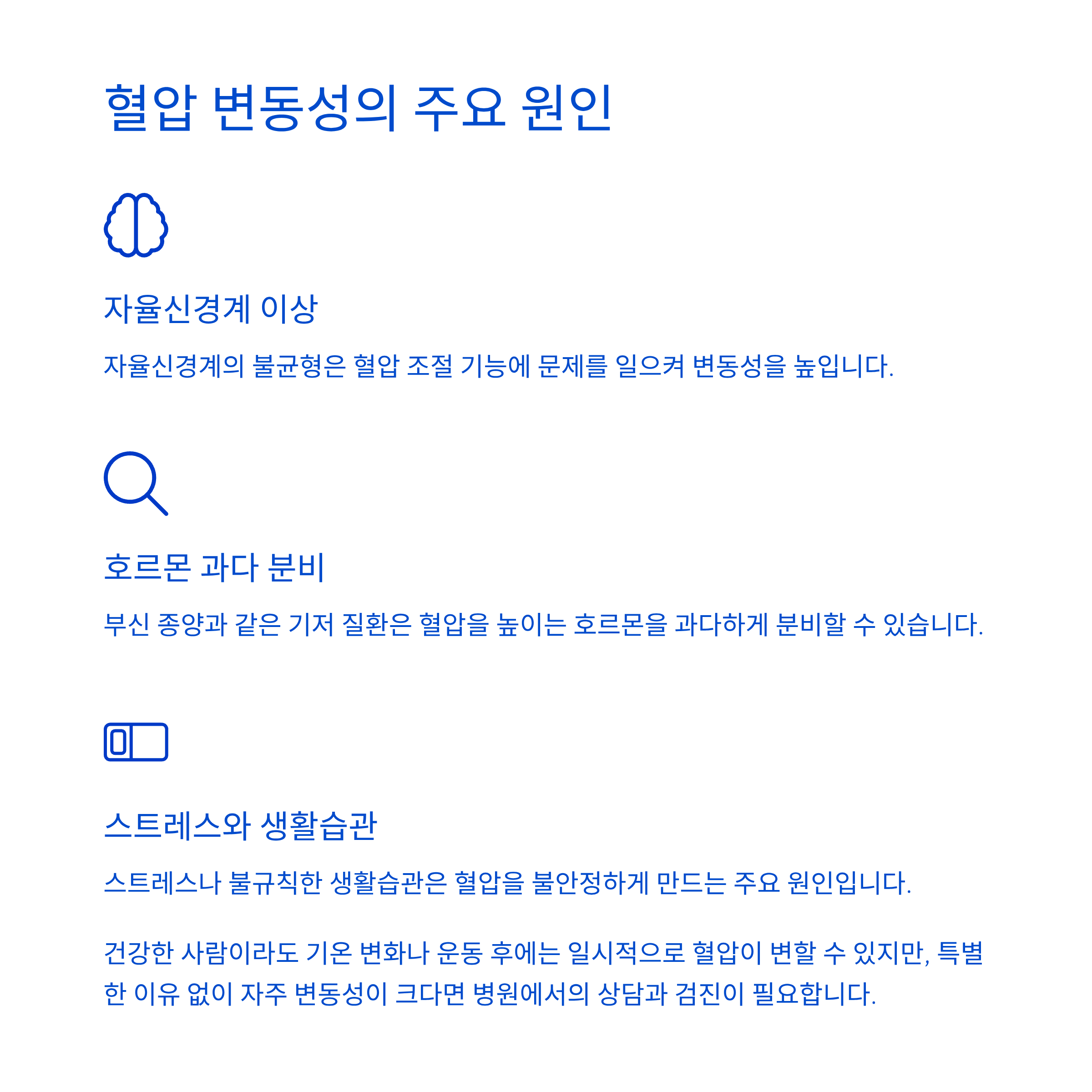 이 외에도, 혈관 탄력이 떨어지거나 심장 질환 등이 있을 경우, 혈압이 자주 요동칠 수 있습니다. 건강한 사람이라도 기온 변화나 운동 후에는 일시적으로 혈압이 변할 수 있지만, 특별한 이유 없이 자주 변동성이 크다면 병원에서의 상담과 검진이 필요합니다.