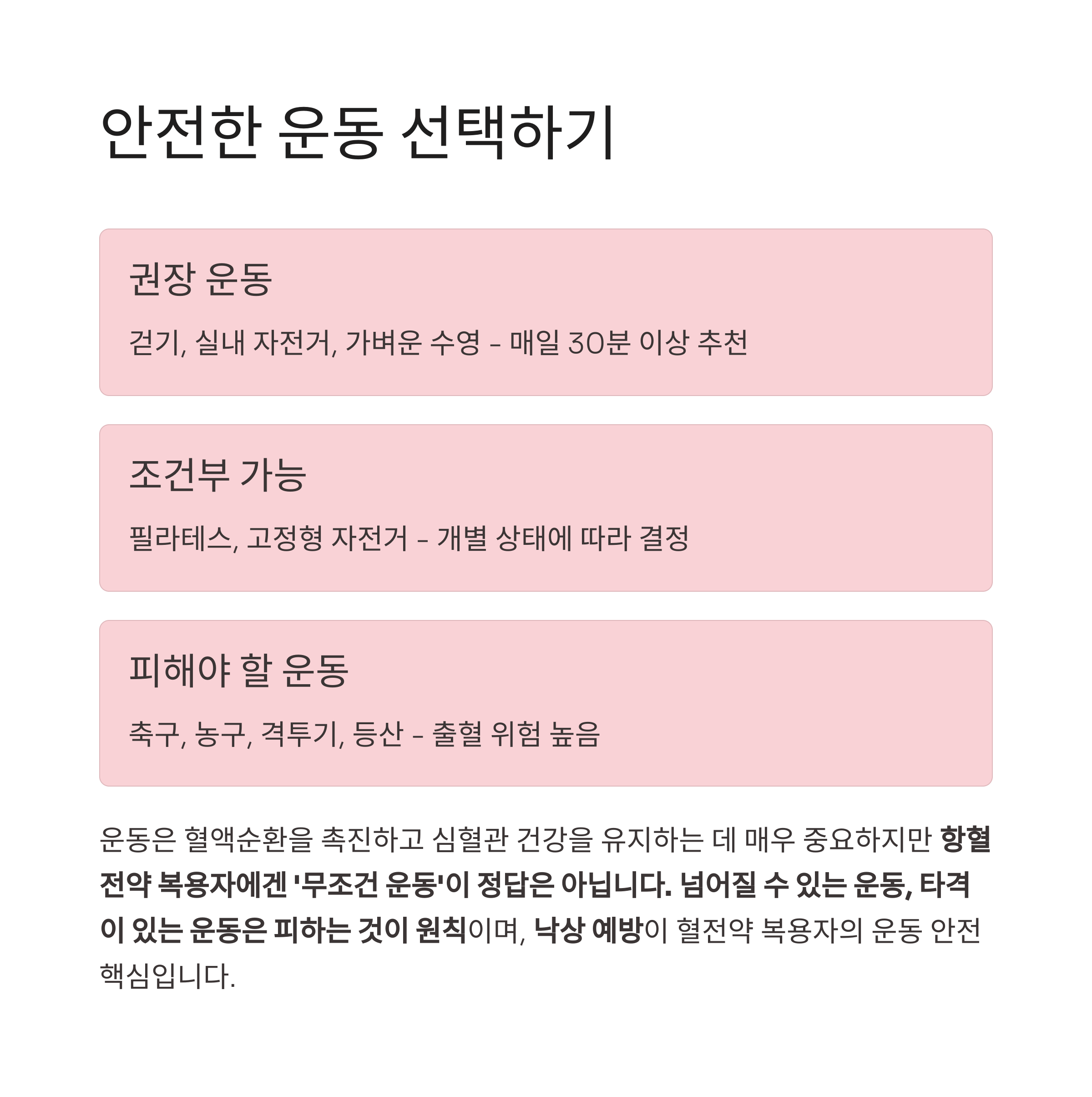 낙상 예방이 혈전약 복용자의 운동 안전 핵심입니다.