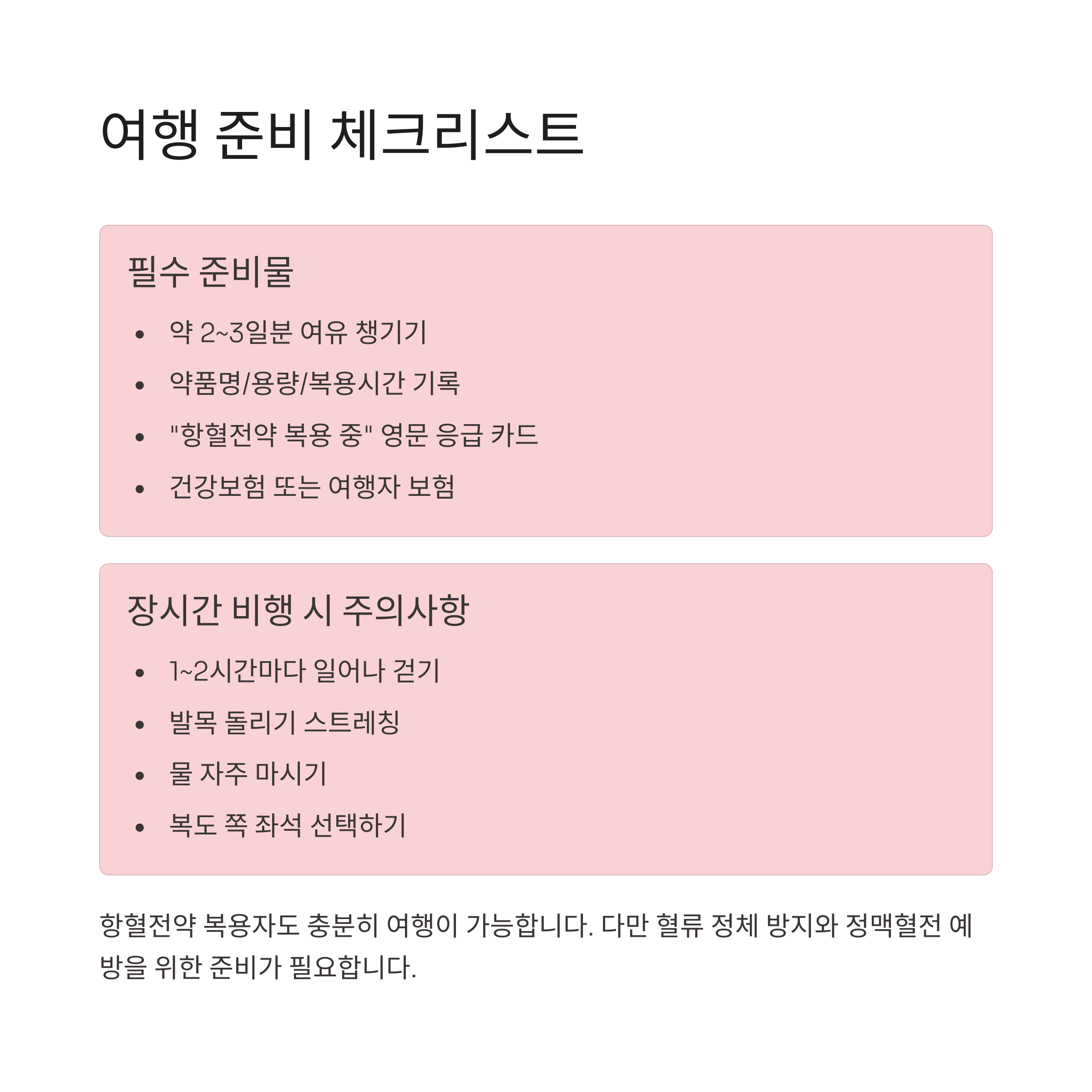 | 응급 카드 소지 | "항혈전약 복용 중" 문구 포함된 영문 메모/카드 지참 |