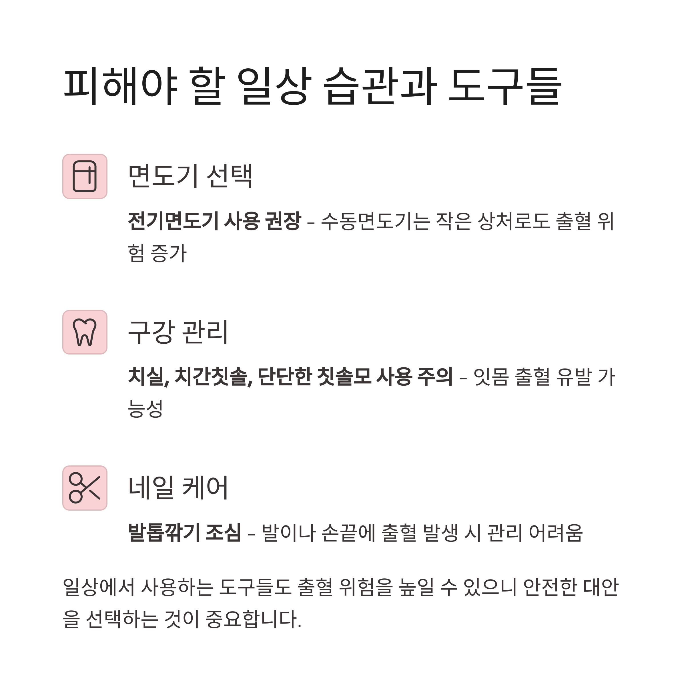 → 항혈전약 복용자는 반드시 전기면도기 사용 권장 - 치실, 치간칫솔, 단단한 칫솔모 사용 주의