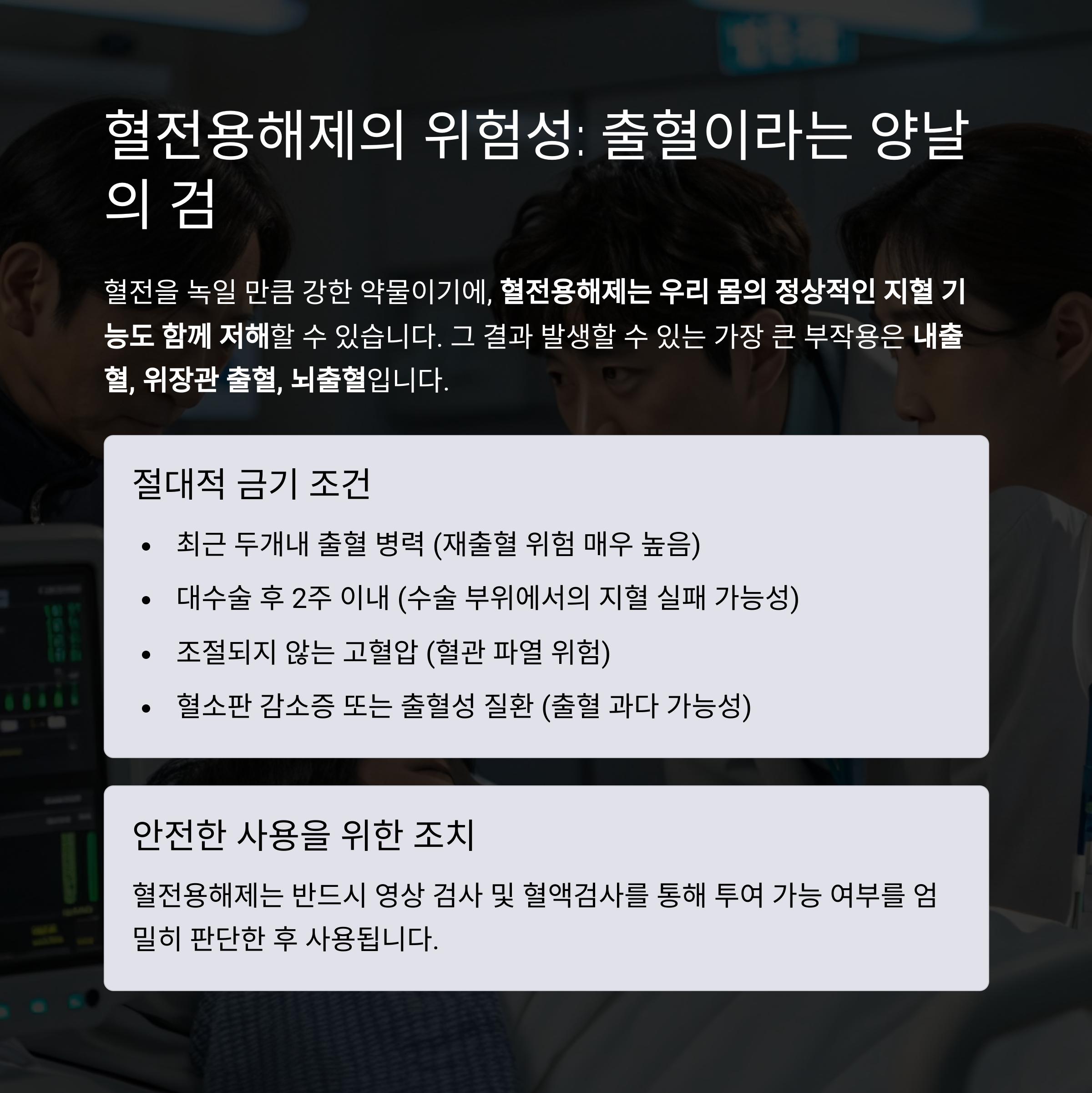 혈전용해제는 우리 몸의 정상적인 지혈 기능도 함께 저해할 수 있습니다.