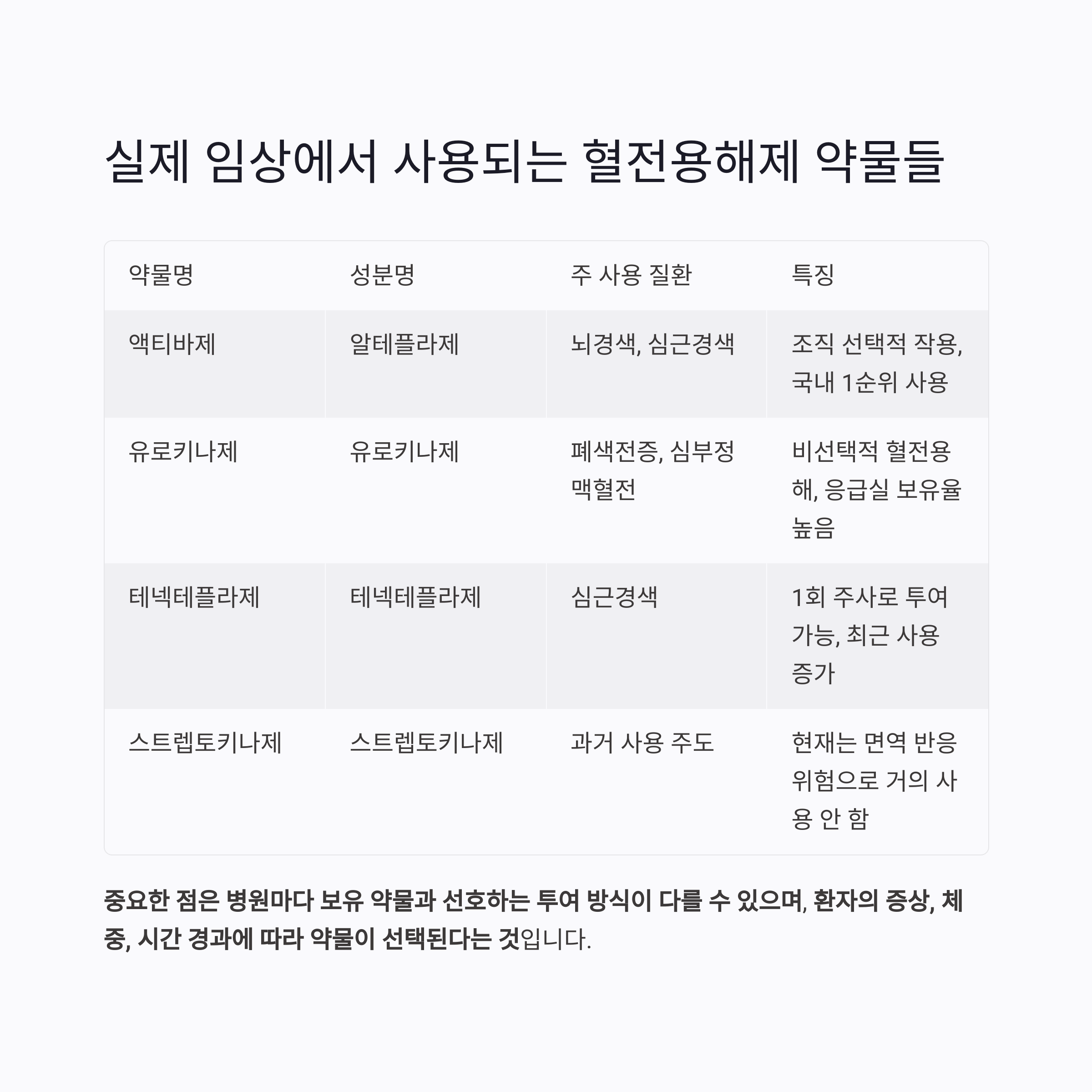 | 스트렙토키나제 | 스트렙토키나제 | 과거 사용 주도 | 현재는 면역 반응 위험으로 거의 사용 안 함 |