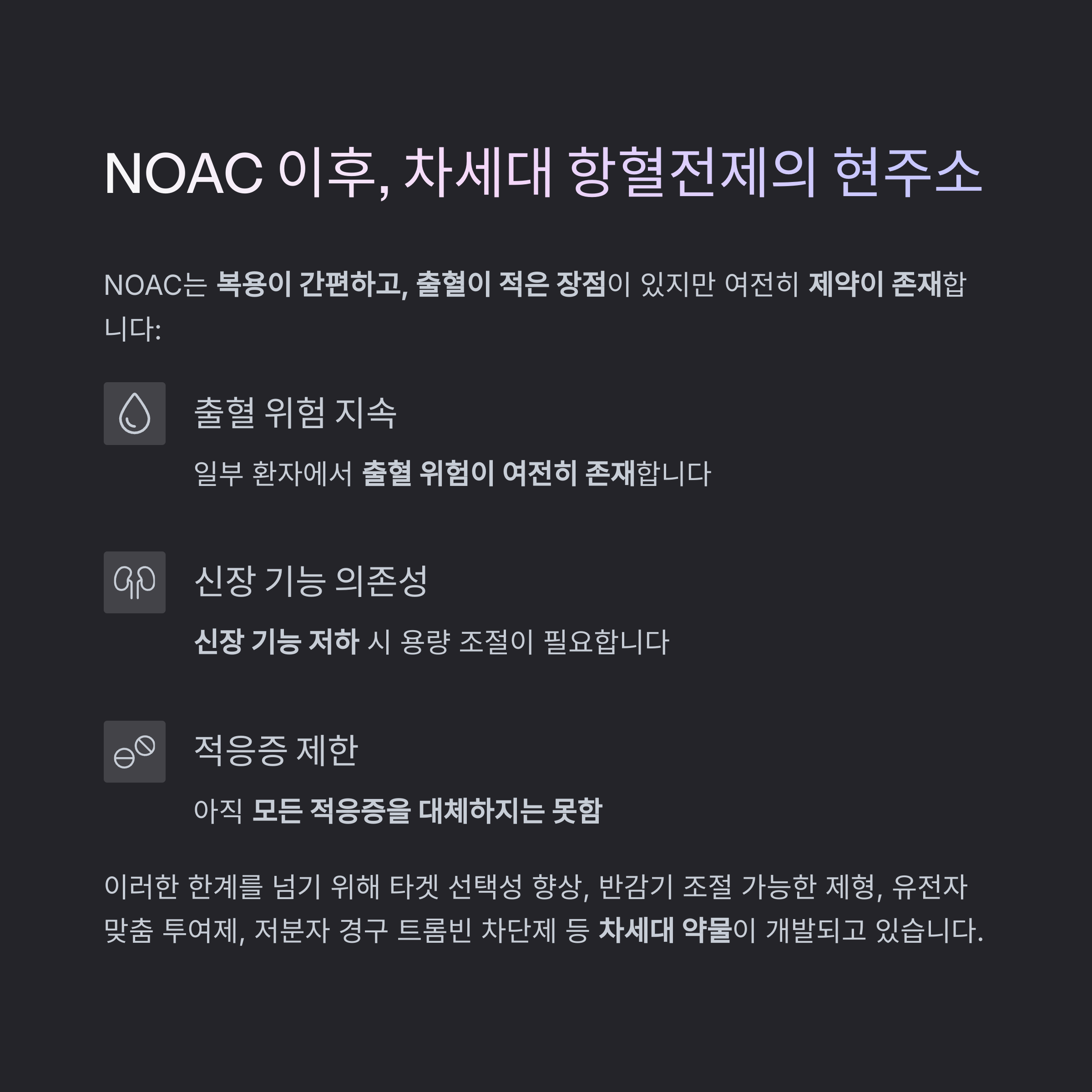 | 저분자 경구 트롬빈 차단제 | 더 빠른 흡수, 더 낮은 출혈 리스크 추구 |