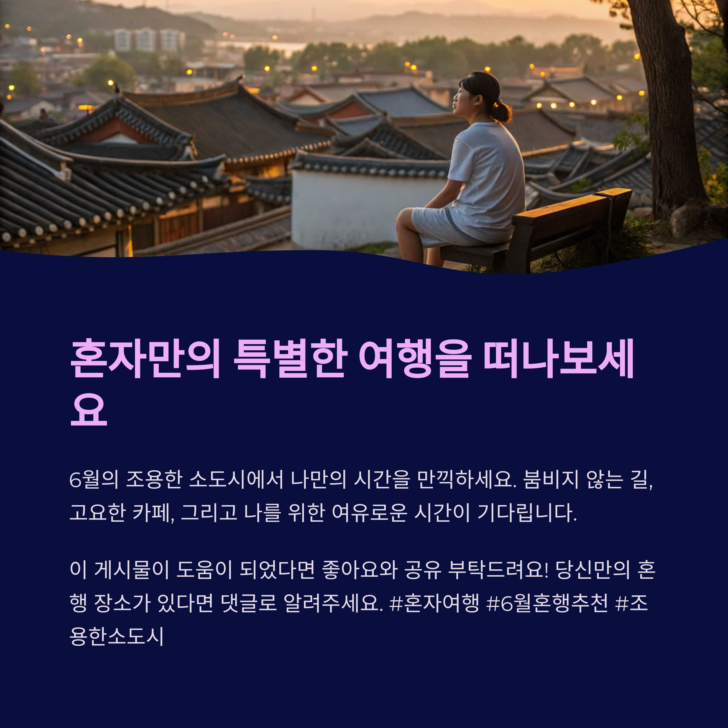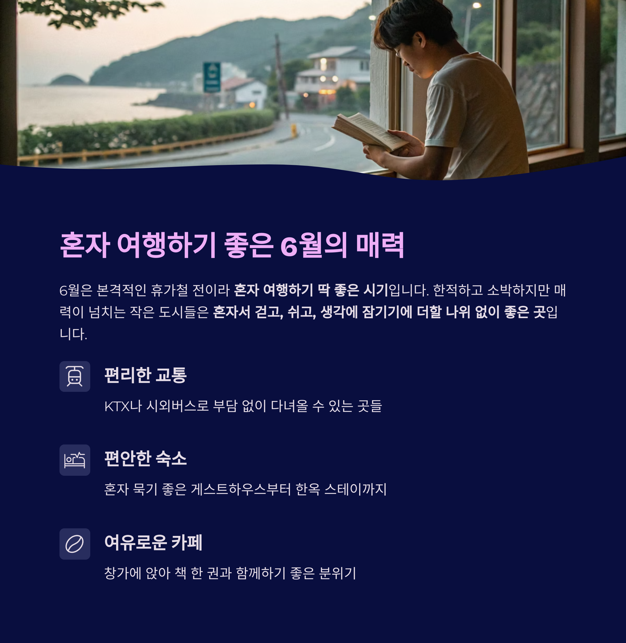 이번 글에서는 교통이 편리하고, 숙소·카페·산책길이 고루 갖춰진 혼자 여행에 최적화된 소도시 6곳을 소개합니다.