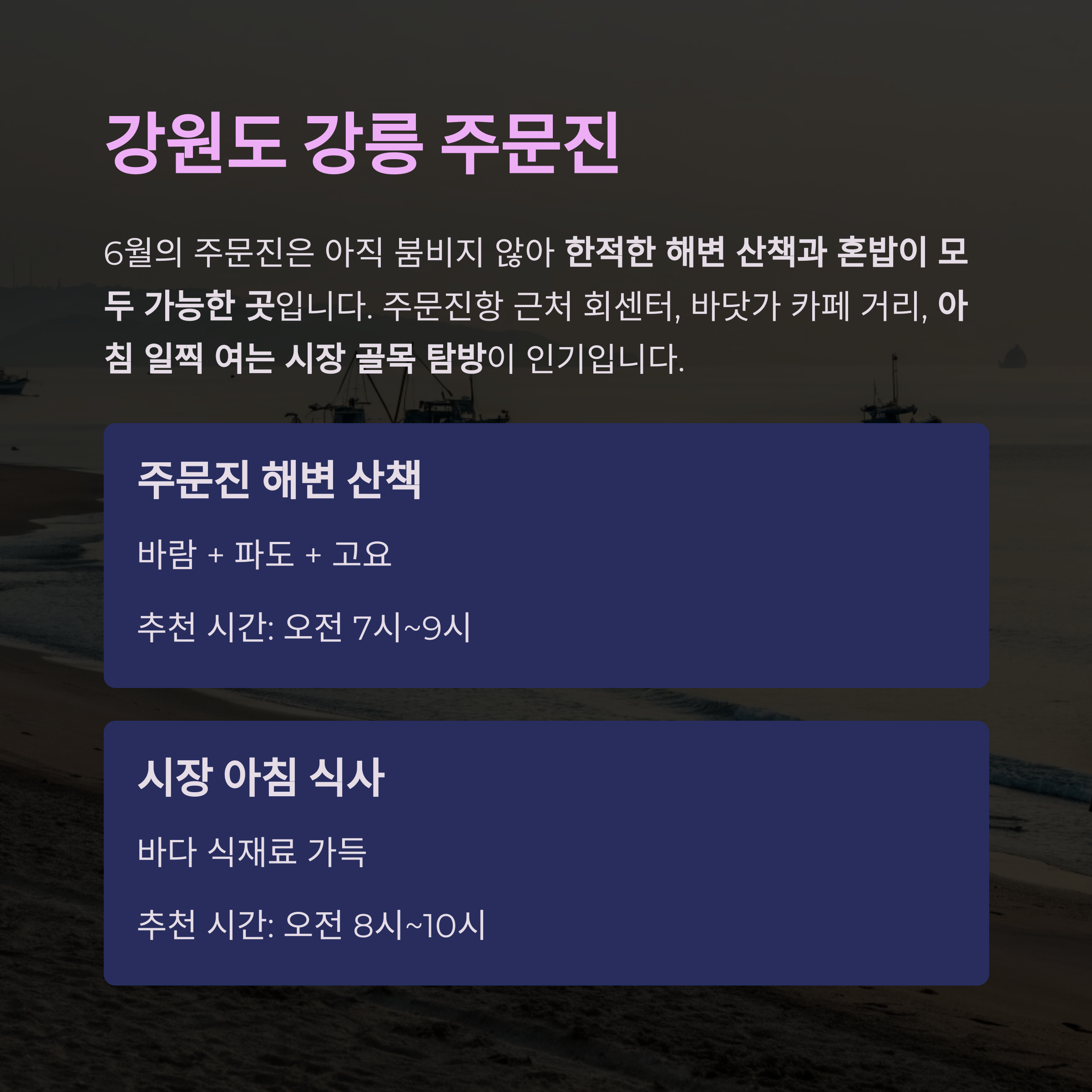 | 주문진 해변 산책 | 바람 + 파도 + 고요 | 오전 7시~9시 |