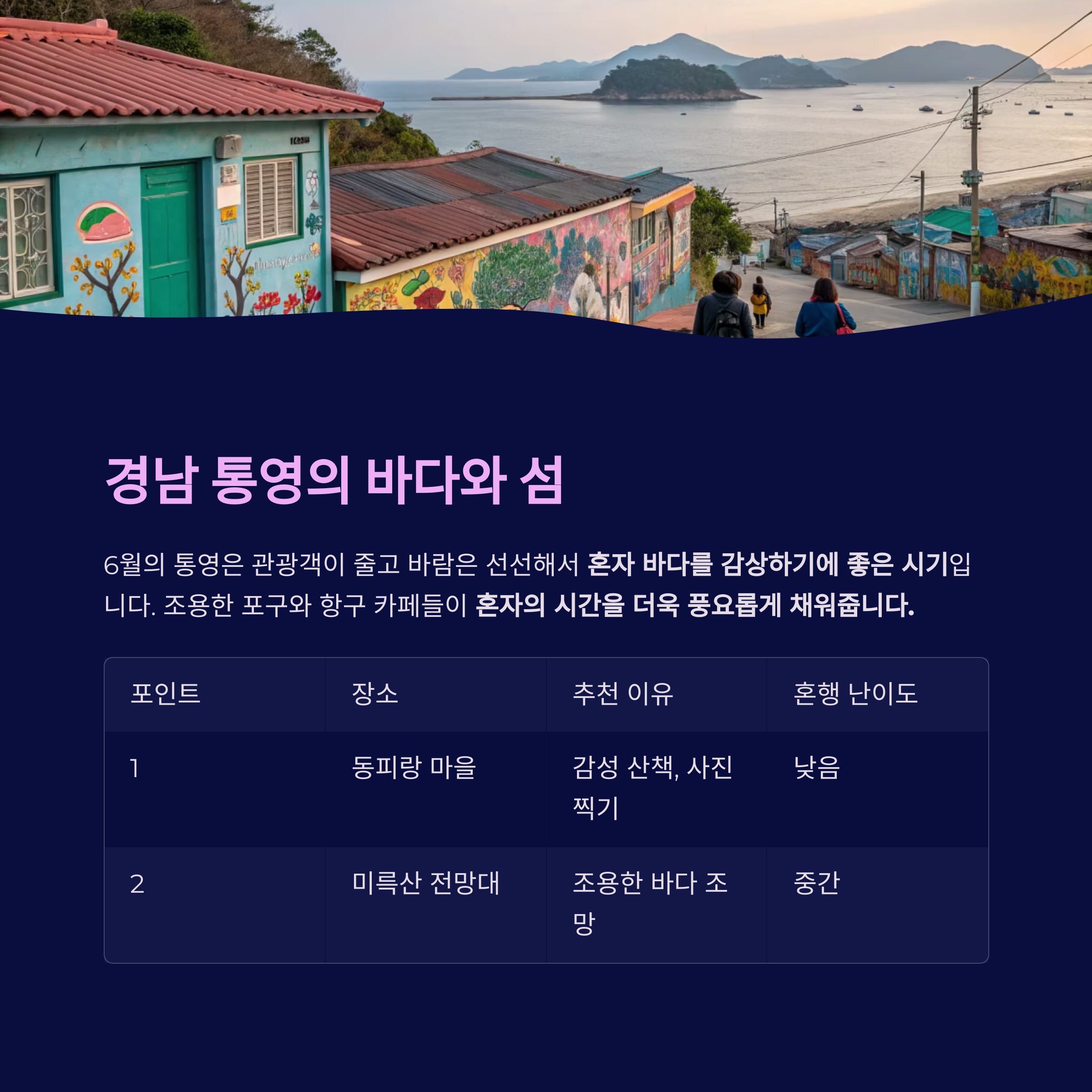 6월의 통영은 관광객이 줄고 바람은 선선해서 혼자 바다를 감상하기에 좋은 시기입니다.