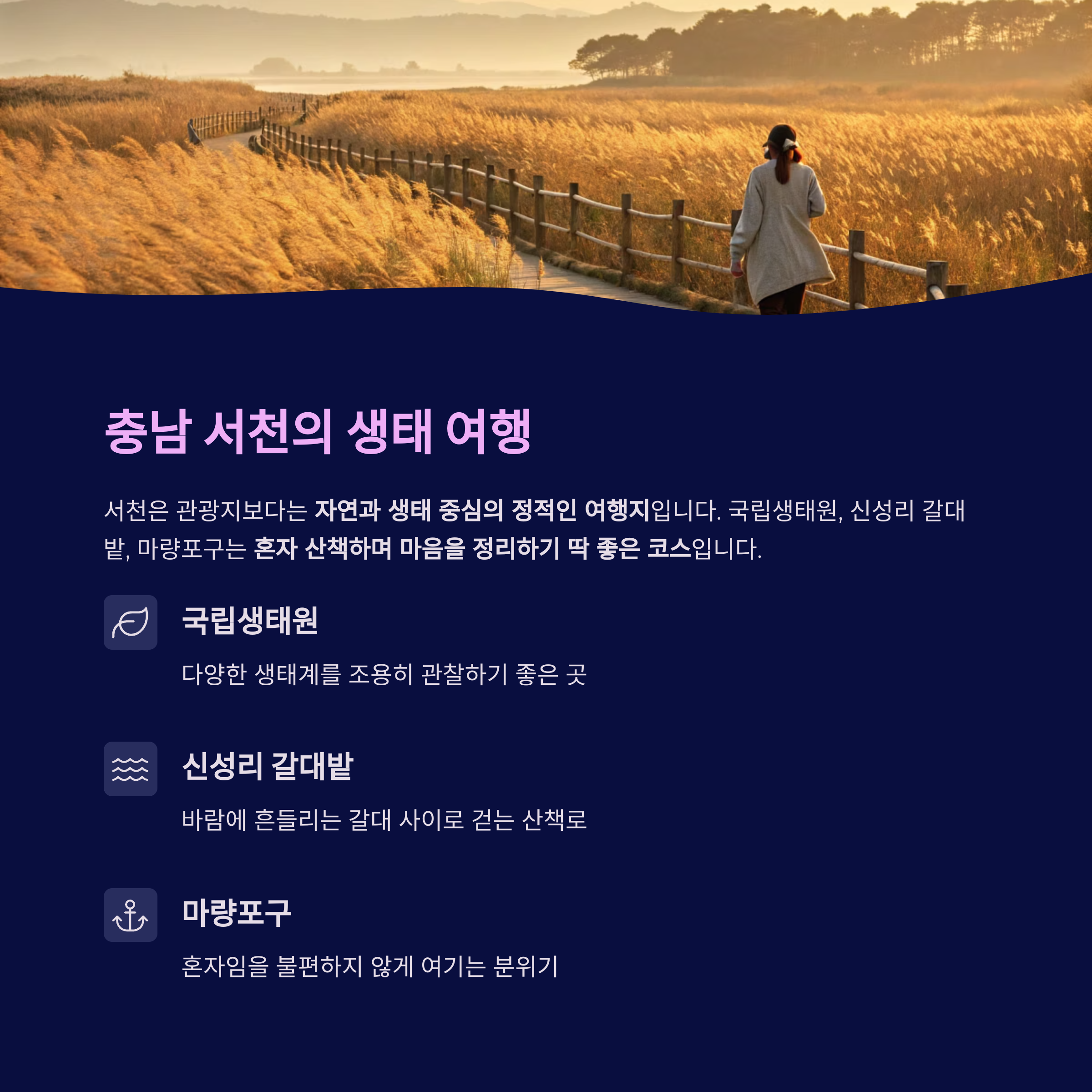 서천은 관광지보다는 자연과 생태 중심의 정적인 여행지입니다.