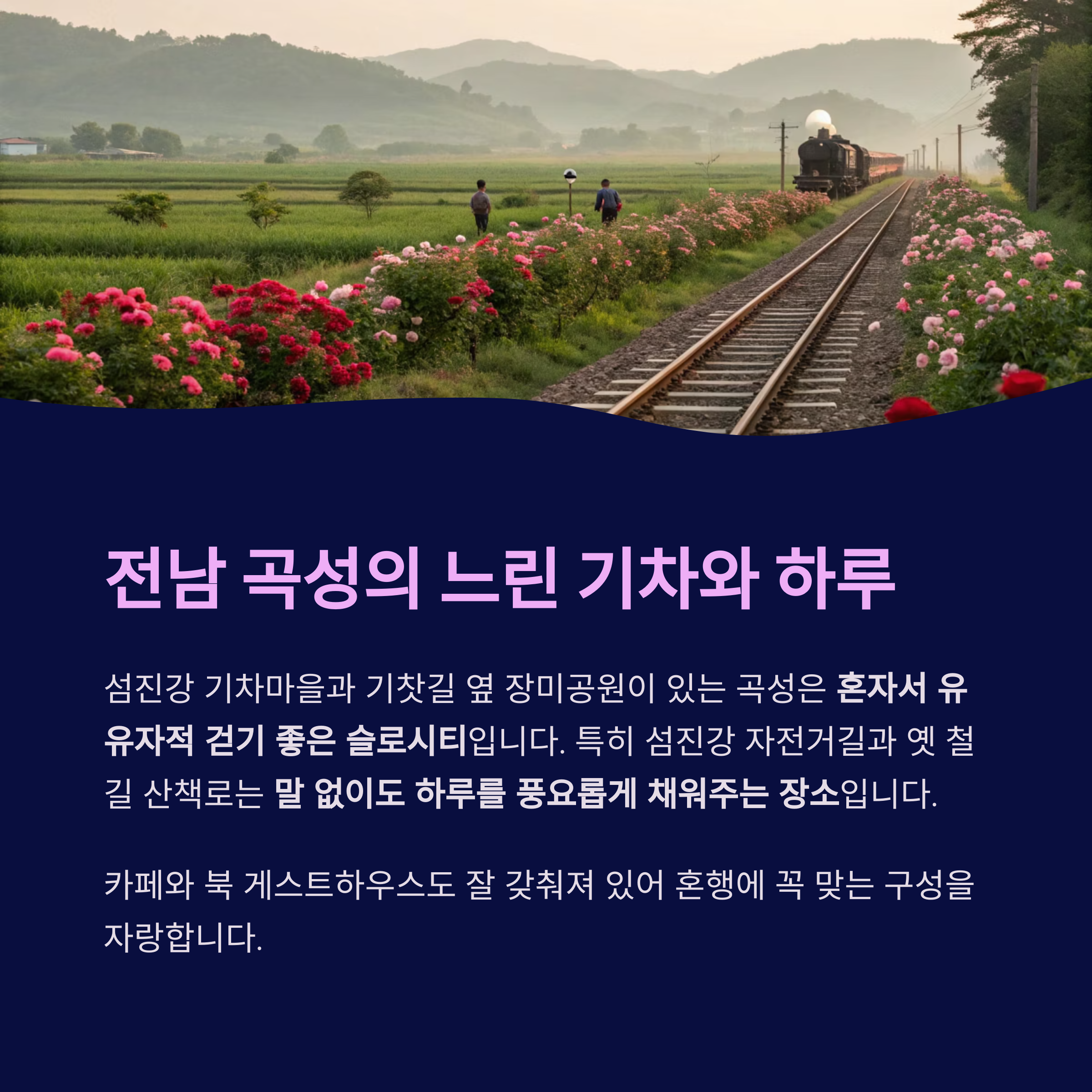 섬진강 기차마을과 기찻길 옆 장미공원이 있는 곡성은 혼자서 유유자적 걷기 좋은 슬로시티입니다.