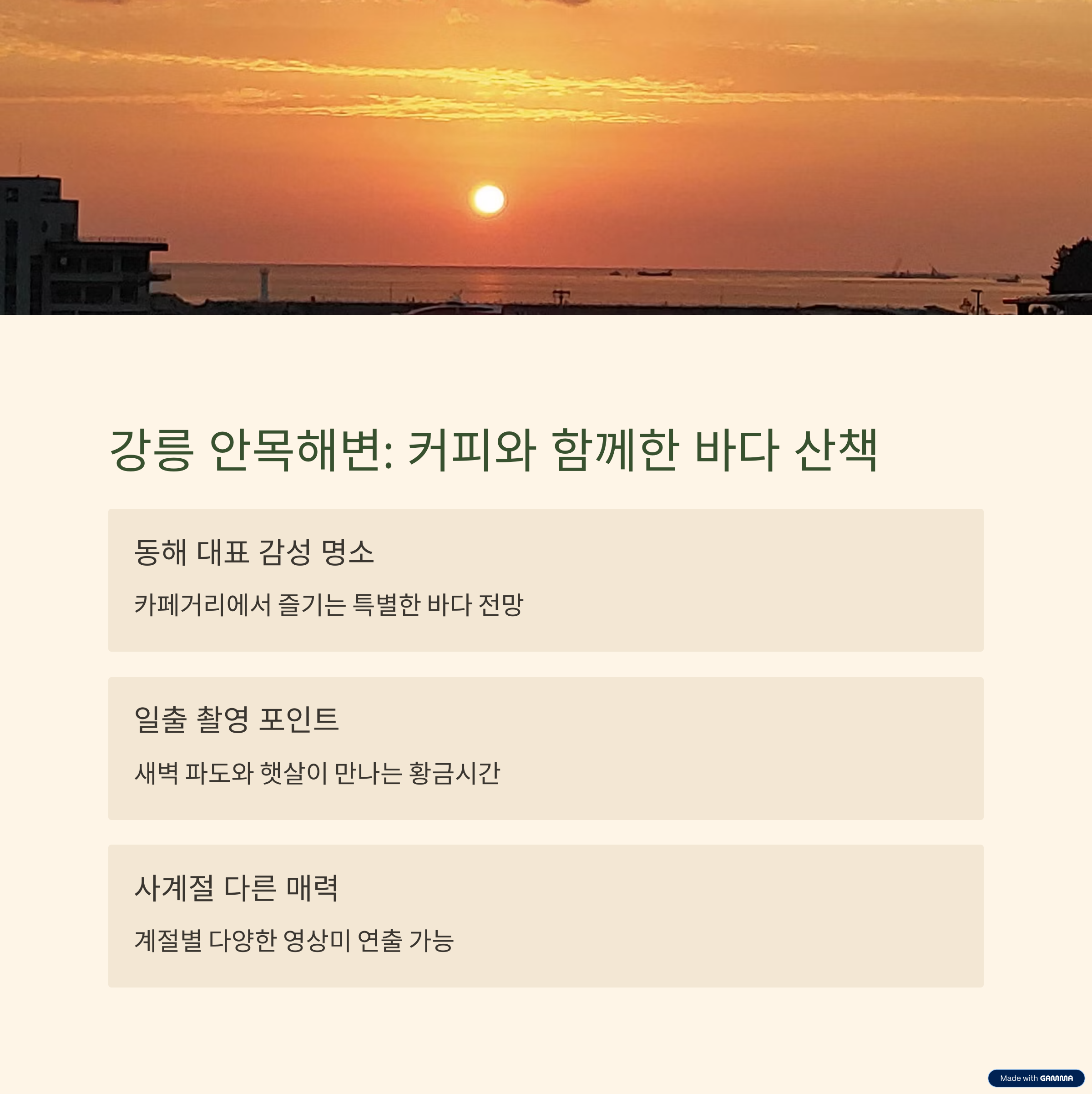| 안목해변 | 강릉 | 커피, 바다, 혼자만의 시간 |