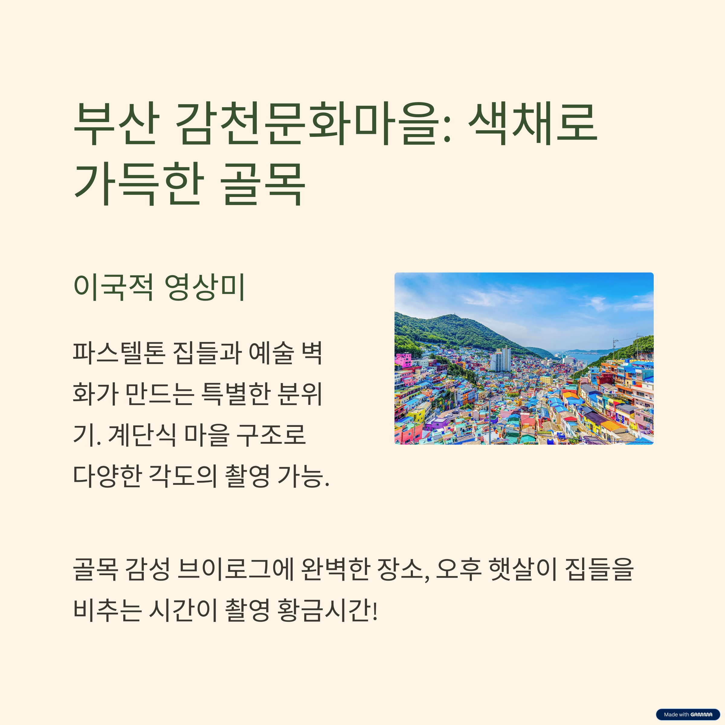 | 감천문화마을 | 부산 | 색감, 골목, 이야기 |