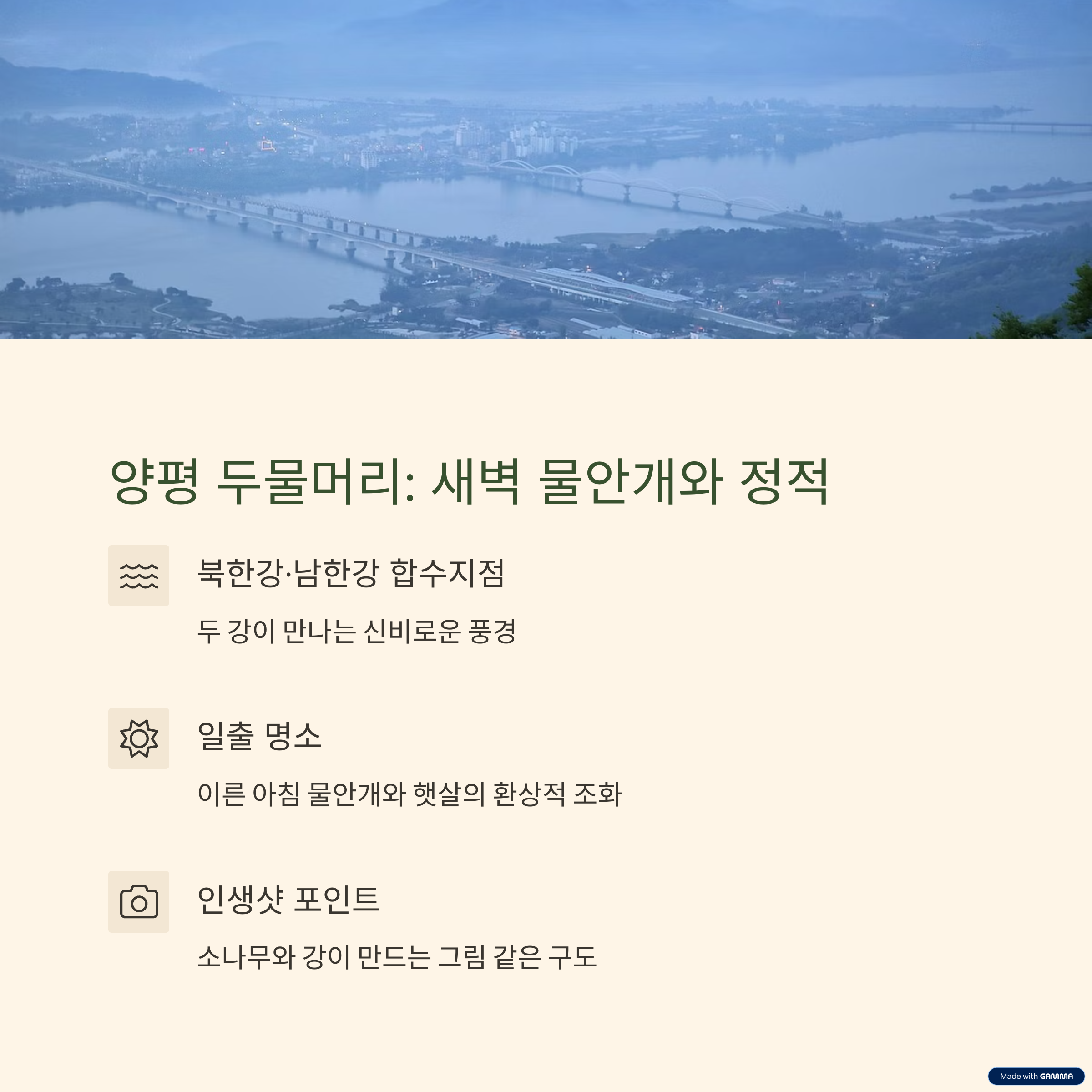 | 두물머리 | 양평 | 사색, 정적, 일출 |