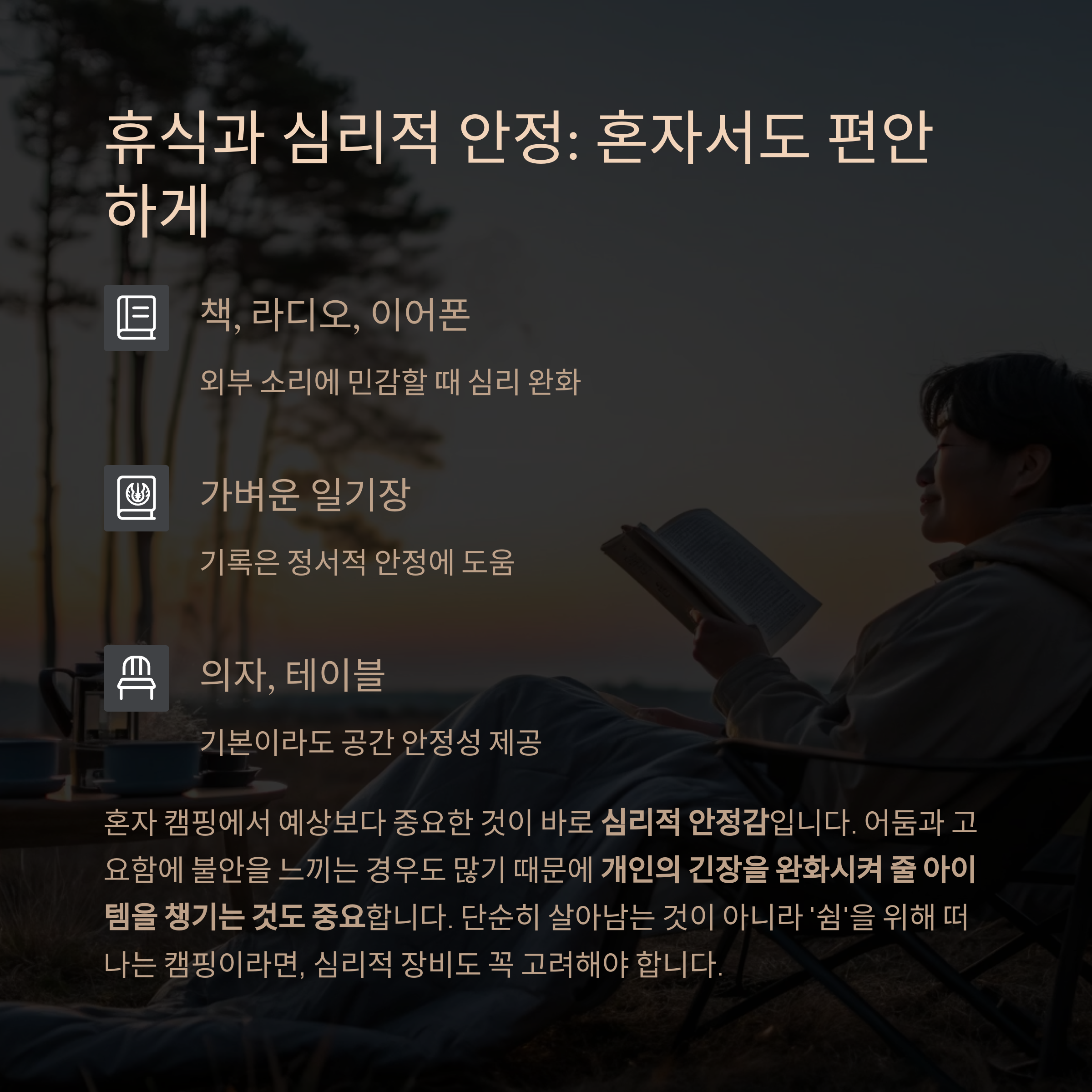 혼자 캠핑에서 예상보다 중요한 것이 바로 심리적 안정감입니다.