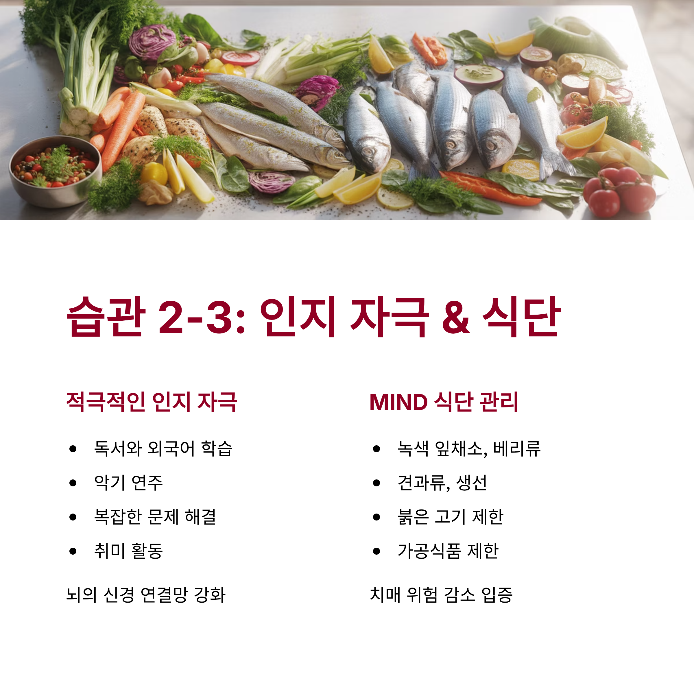 • 왜 중요한가? 뇌 건강에 최적인 MIND 식단 (지중해식과 대시(DASH) 식단을 결합한 형태)이 치매 위험을 낮춘다는 연구 결과가 많습니다. 특히 녹색 잎채소, 베리류, 견과류, 생선 등을 충분히 섭취하고, 붉은 고기와 가공식품은 제한해야 합니다.
