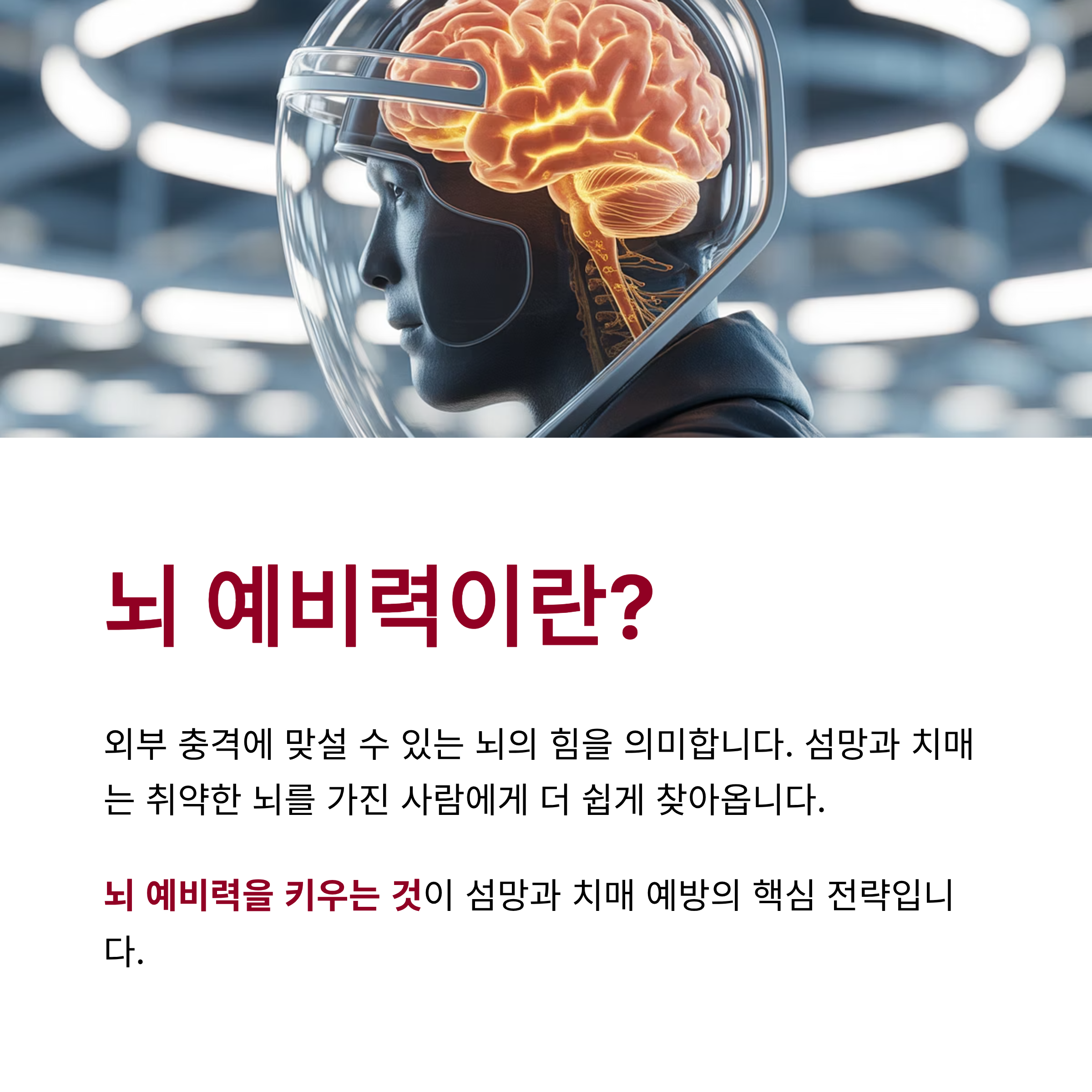 두려움은 정보를 알지 못할 때 커집니다. 이제는 두 질환의 발생 위험을 낮추고, 삶의 질을 높이는 데 초점을 맞출 때입니다. 섬망과 치매의 예방 및 관리 핵심은 **'뇌 예비력(Brain Reserve)'**을 키우는 것입니다. 이는 외부 충격에 맞설 수 있는 뇌의 힘을 의미합니다.