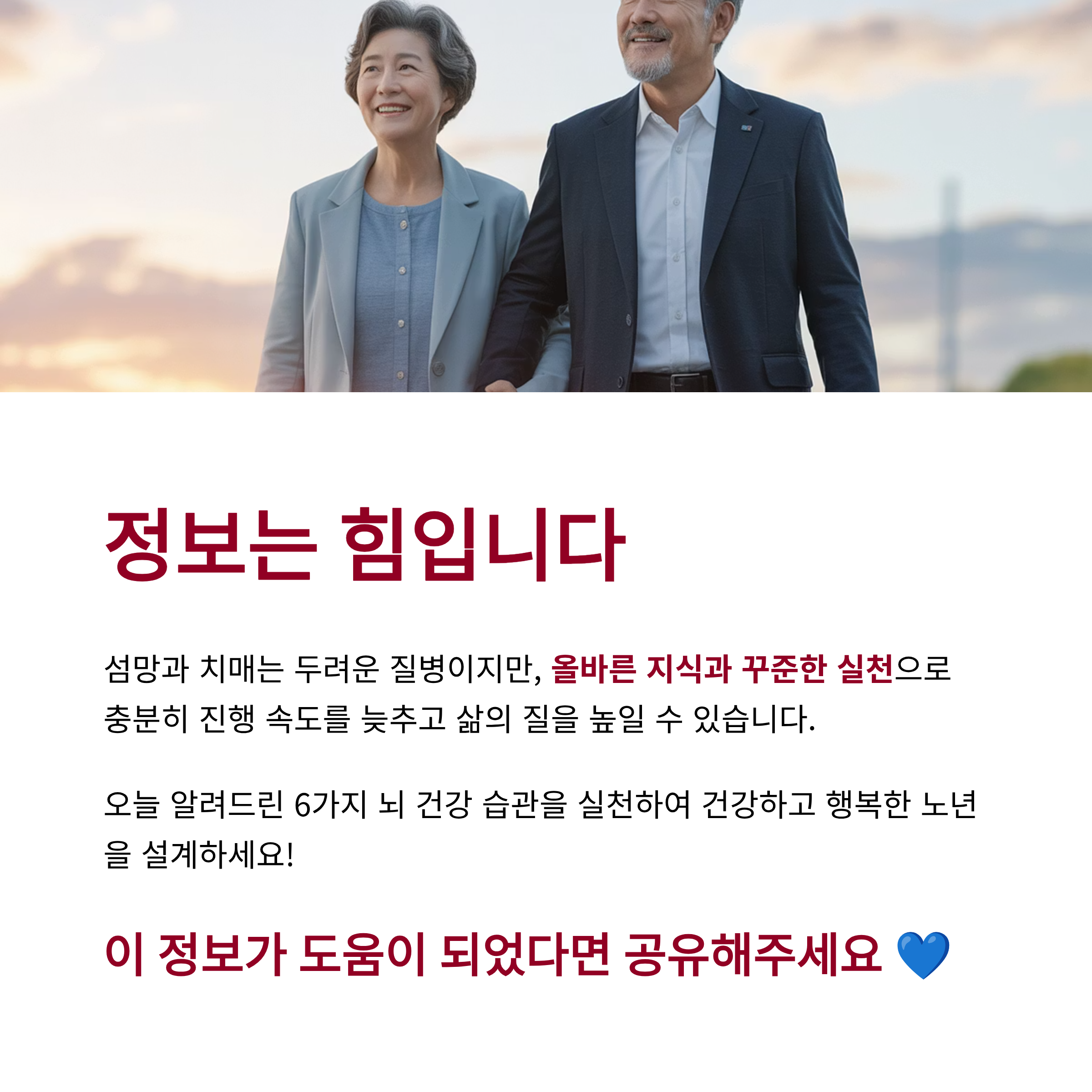 오늘 알려드린 6가지 뇌 건강 습관을 꾸준히 실천하여, 건강하고 행복한 노년을 설계하시길 응원합니다!