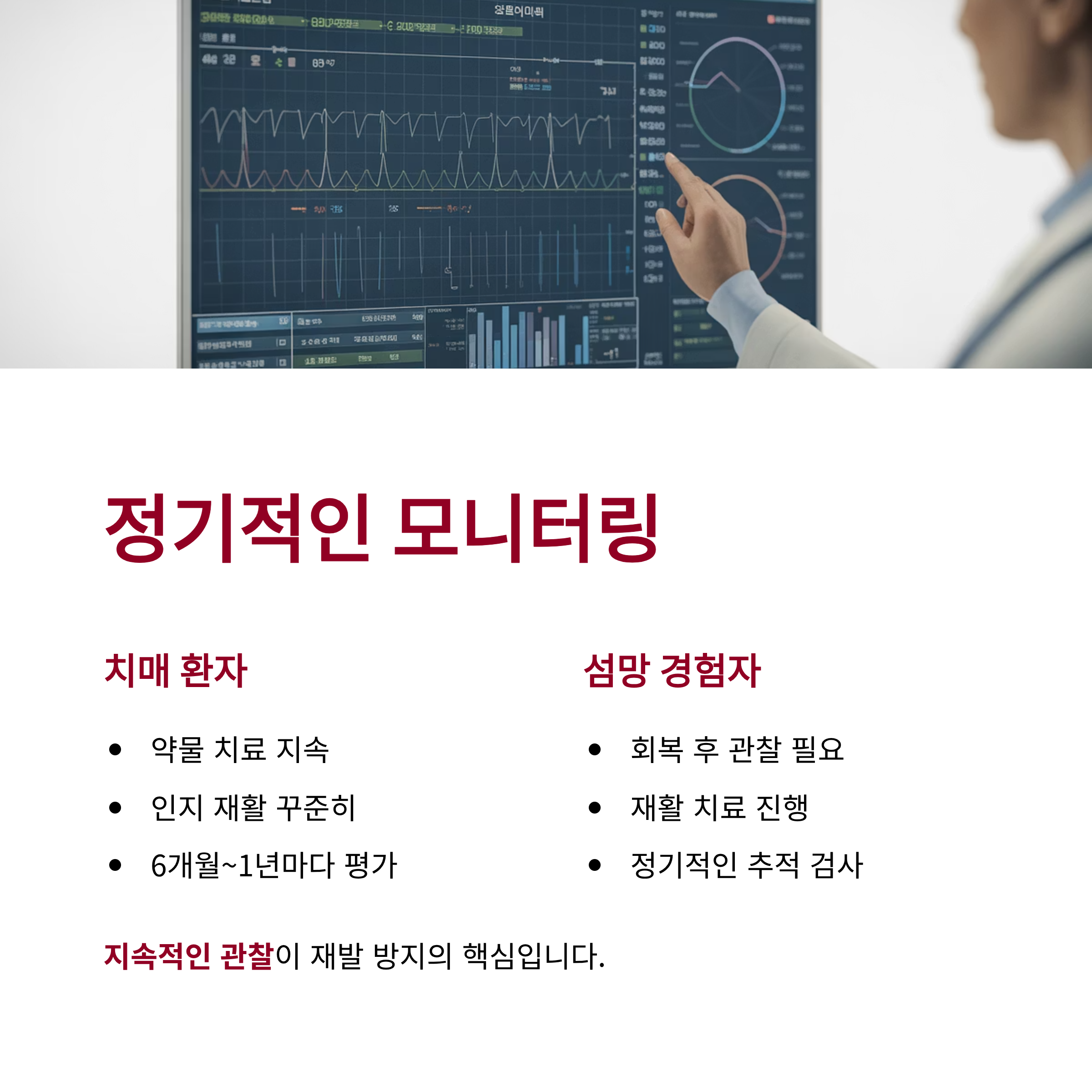 • 치매 환자: 약물 치료와 인지 재활을 꾸준히 받고, 매 6개월~1년마다 인지 기능 평가를 통해 진행 정도를 확인해야 합니다.