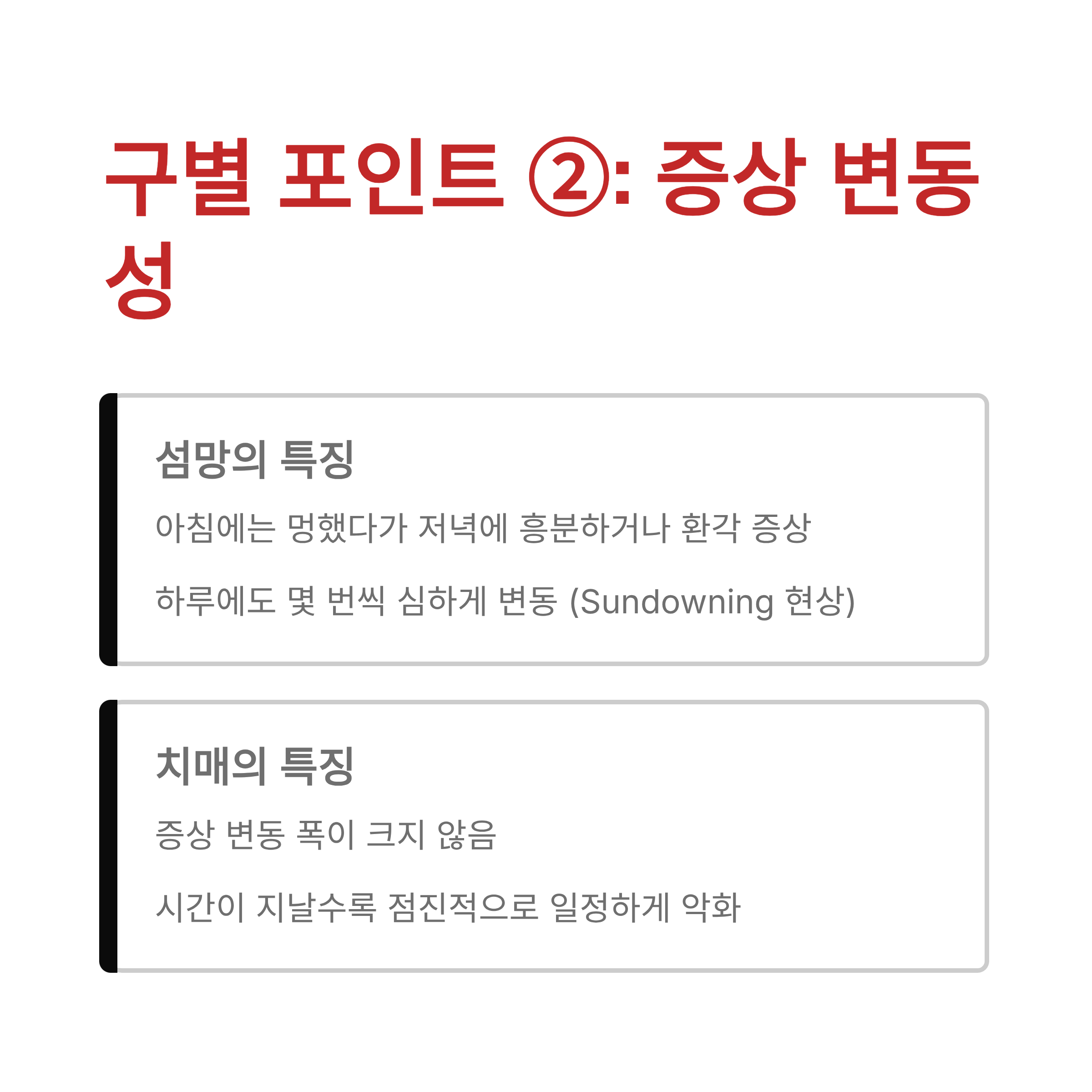 - 치매: 증상의 변동 폭이 크지 않고, 일정하게 나빠집니다.