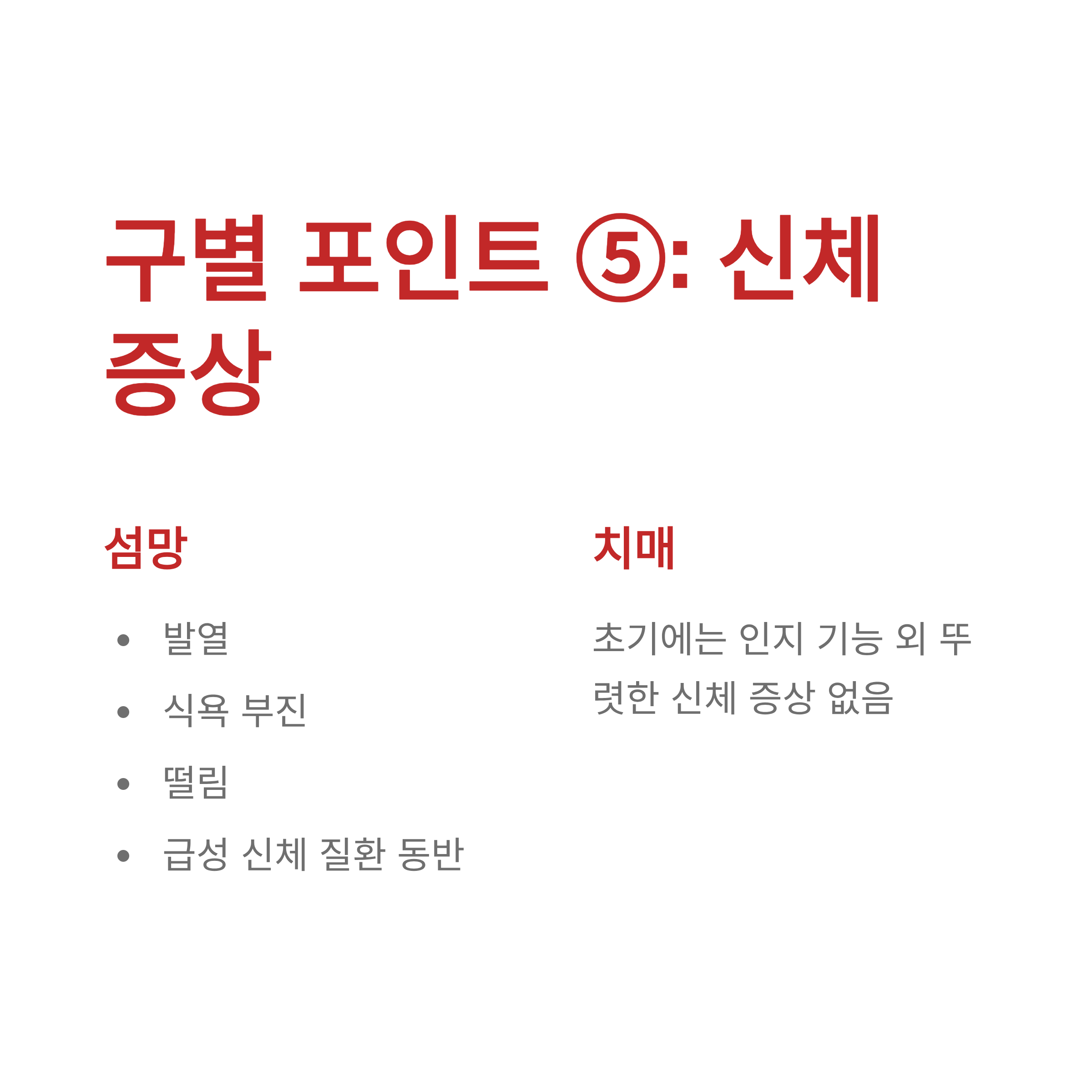 - 섬망: 유발 원인에 따라 발열, 식욕 부진, 떨림 등 급성 신체 질환 증상이 동반될 수 있습니다.