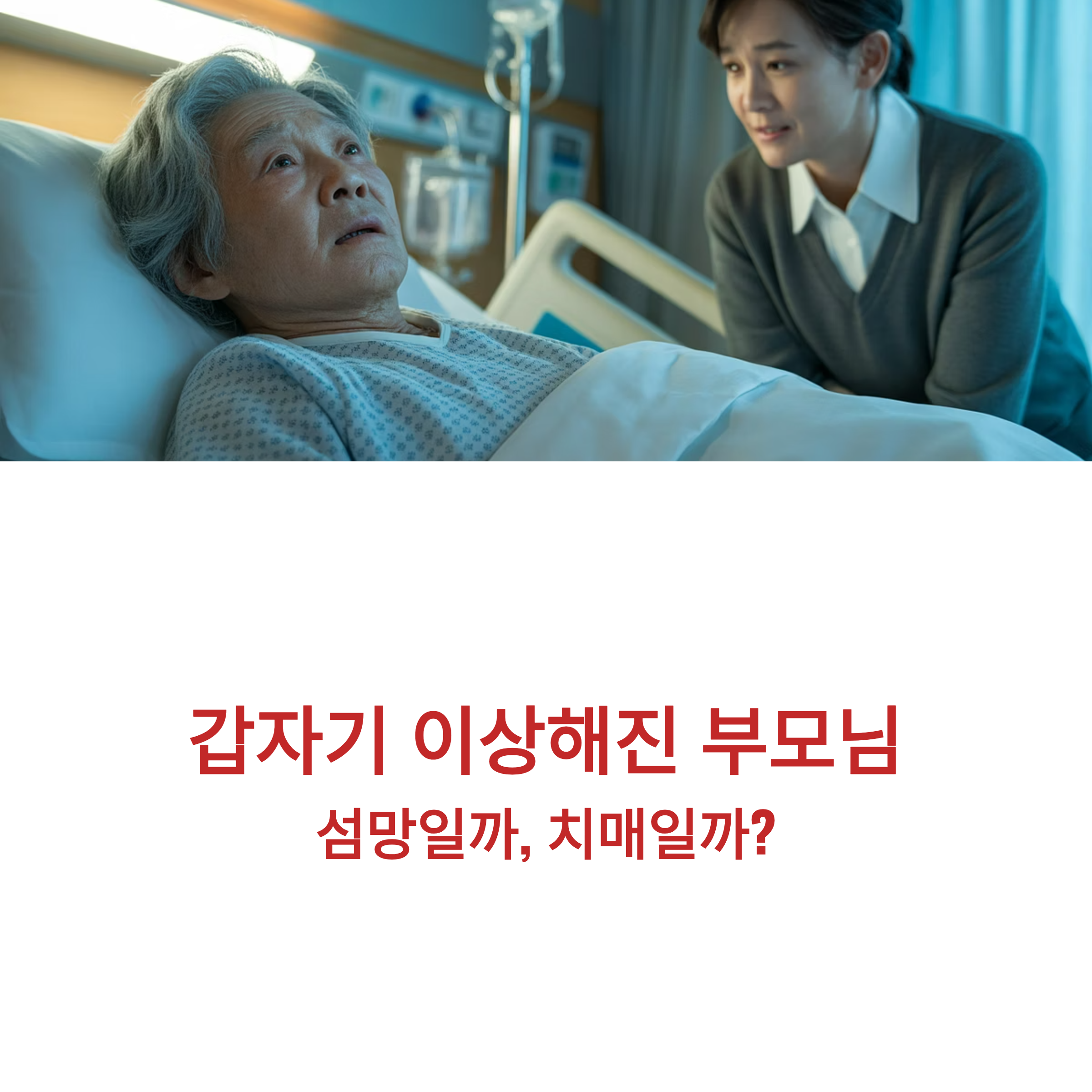 따라서 갑작스럽게 혼란, 환각, 심한 변동성 등의 증상이 나타난다면, 단순한 '나이 탓'이나 '치매'로 속단하지 마시고 즉시 응급실을 방문하거나 의료진과 상의해야 합니다.