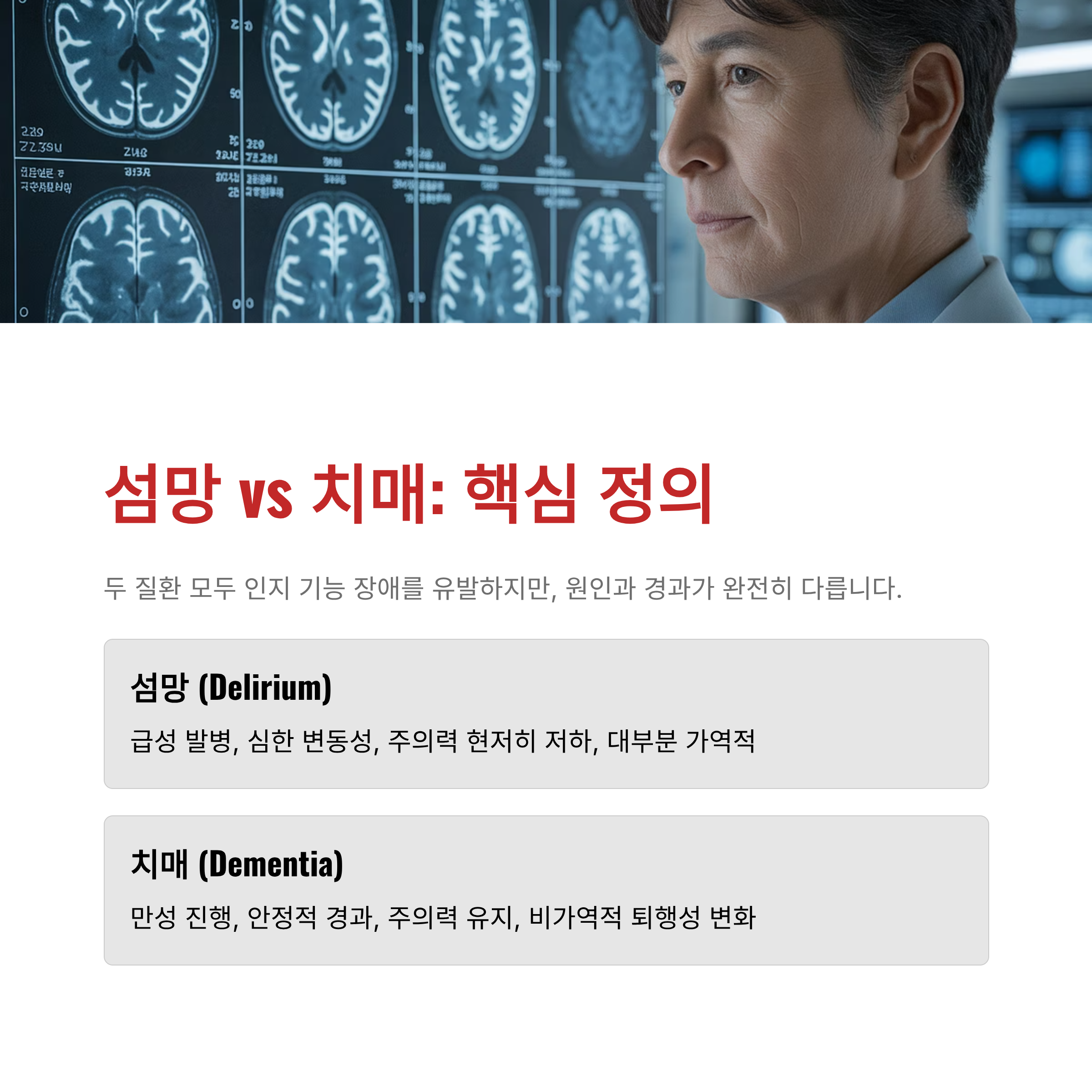 📌 핵심 요약: 치매는 서서히 찾아와 비가역적인 기억력 장애가 주를 이루지만, 섬망은 갑자기 찾아와 주의력 장애와 의식의 혼탁이 주를 이루며 대개 회복됩니다.