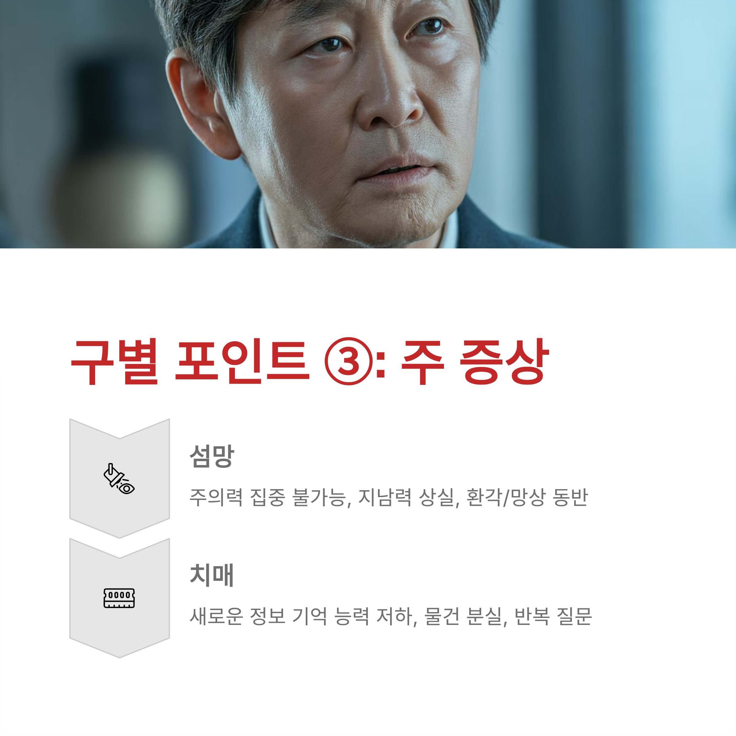 - 섬망: 주의력 집중이 불가능하고, 지남력 상실(시간, 장소, 사람 혼동), 심한 경우 환각/망상이 동반됩니다.