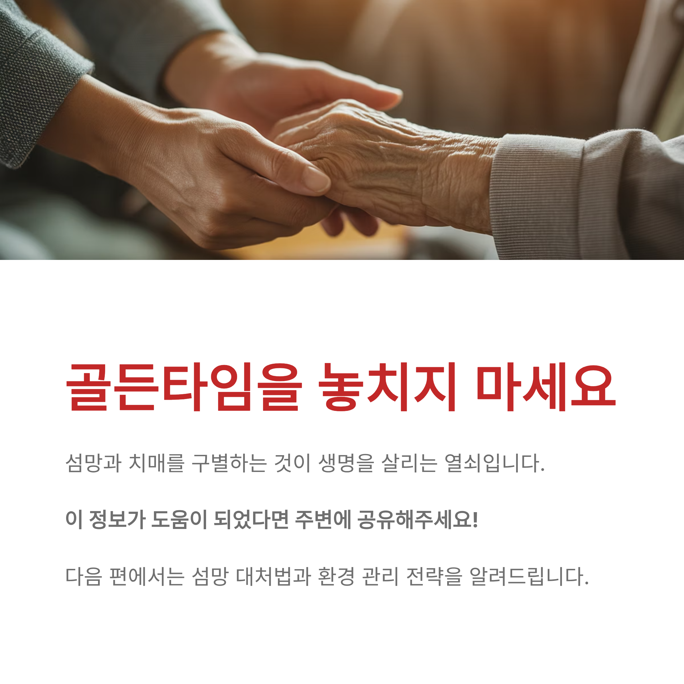 다음 2부에서는 섬망이 왜 위험하며, 가정 및 병원에서 섬망 증상 발생 시 즉시 적용할 수 있는 구체적인 대처법과 환경 관리 전략에 대해 자세히 알아보겠습니다. 기대해주세요!