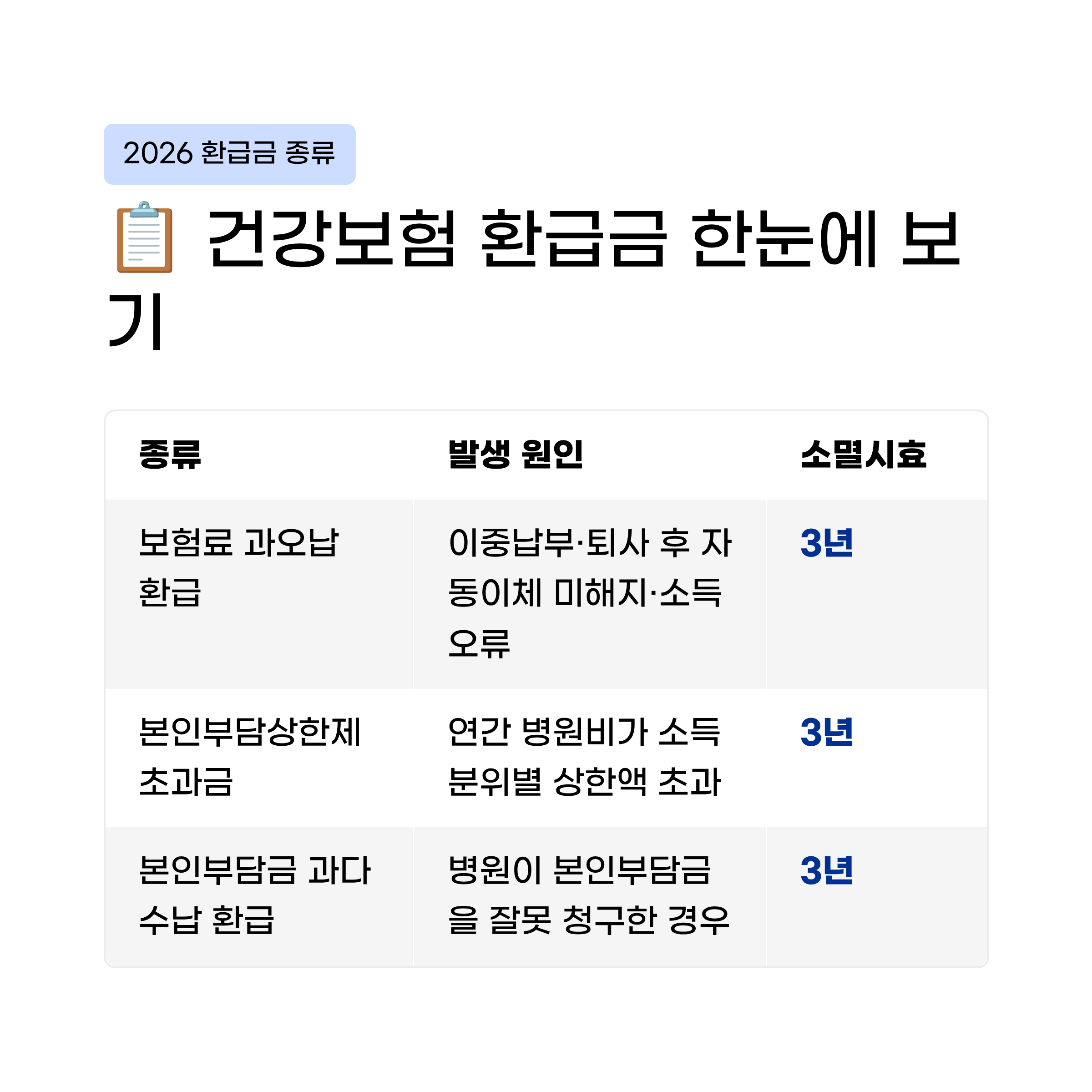 | 본인부담금 과다수납 환급 | 병원이 본인부담금을 잘못 청구한 경우 | 심사 후 자동 환급 또는 신청 | 3년 |
