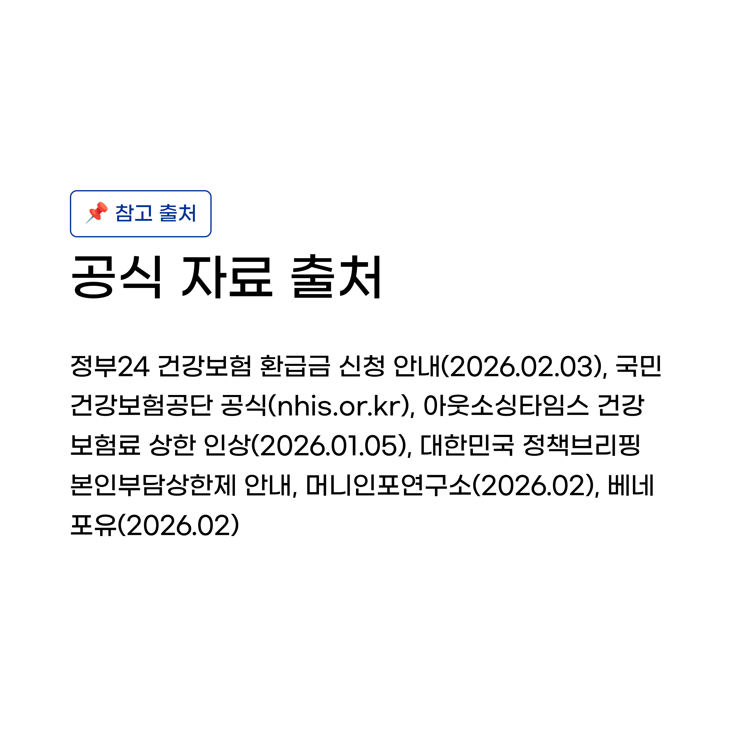 📌 참고 출처: 정부24 건강보험 환급금 신청 안내(2026.02.03), 국민건강보험공단 공식(nhis.or.kr), 아웃소싱타임스 건강보험료 상한 인상(2026.01.05), 대한민국 정책브리핑 본인부담상한제 안내, 머니인포연구소(2026.02), 베네포유(2026.02)